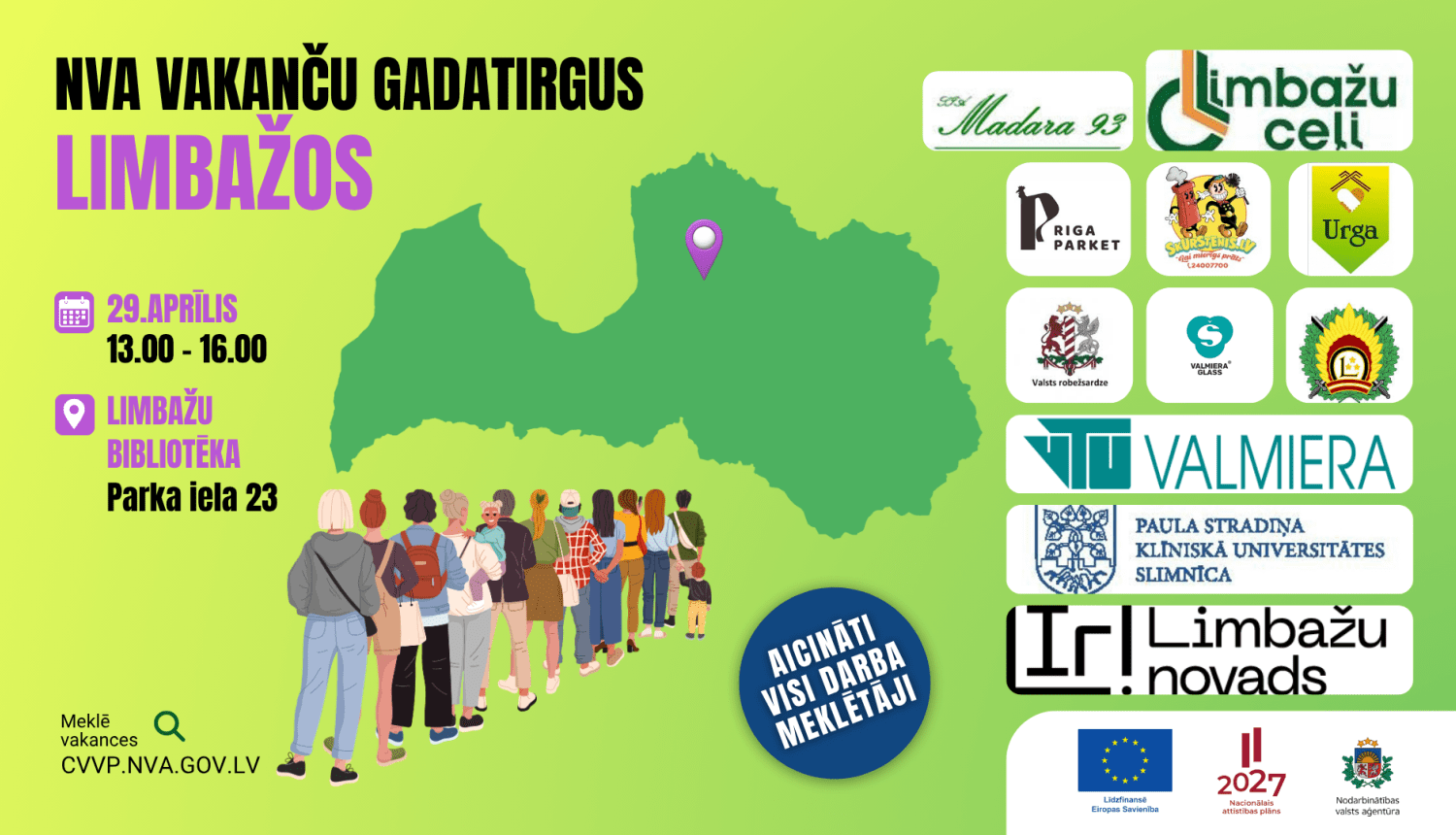 29. aprīlī no plkst. 13.00 līdz 16.00 Limbažu bibliotēkā (Parka ielā 23, Limbažos) Nodarbinātības valsts aģentūra (NVA) sadarbībā ar darba devējiem rīko reģionālo vakanču gadatirgu. Apmeklējums – bez maksas! Pasākums tiek organizēts Eiropas Sociālā fonda Plus projekta “Nodarbinātības valsts aģentūras veiktspējas stiprināšana” ietvaros.