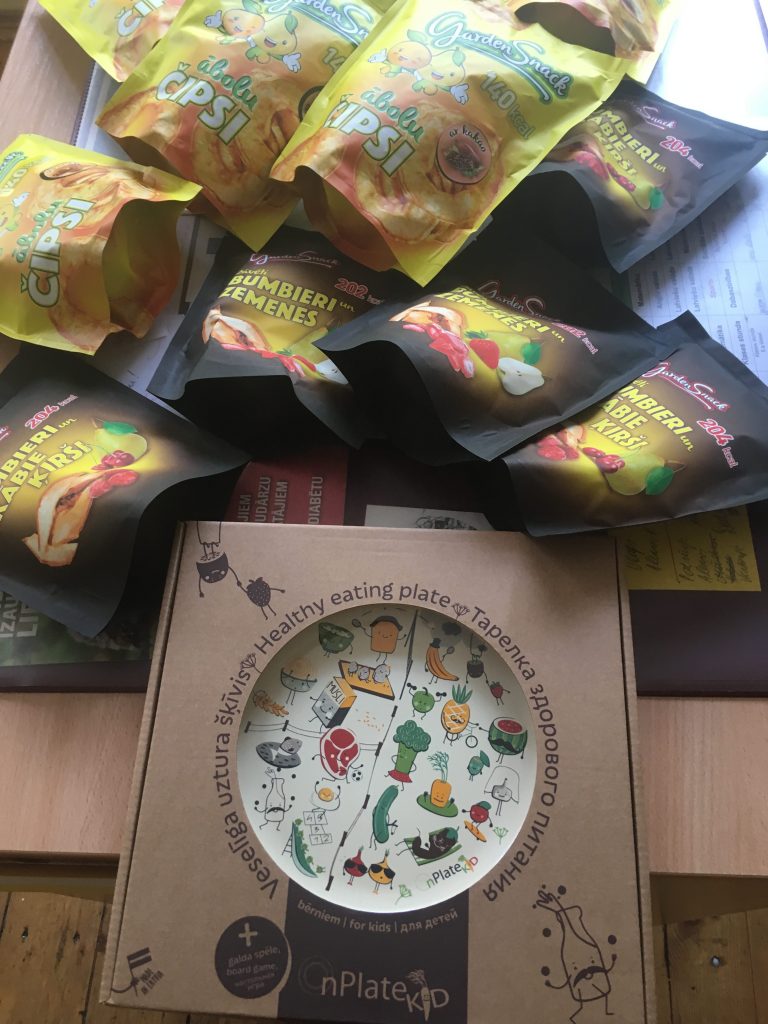 Katra komanda saņēma dāvanās veselīgos našķus “Ābolu čipsus” ar kakao (140 kcal), “Žāvētus bumbierus ar zemenēm un ķiršiem”, katra klase ieguva īpašu pareiza uztura šķīvi, katrs skolēns ieguva dažādu sabalansēta ēdiena recepšu paliktni.