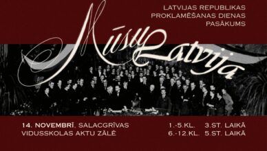 14.novembrī Salacgrīvas vidusskolas saime pulcējās uz svinīgu un sirsnīgu pasākumu “Mūsu Latvija”, lai kopīgi godinātu mūsu valsts dzimšanas dienu. Skatuve, rotāta Latvijas karoga