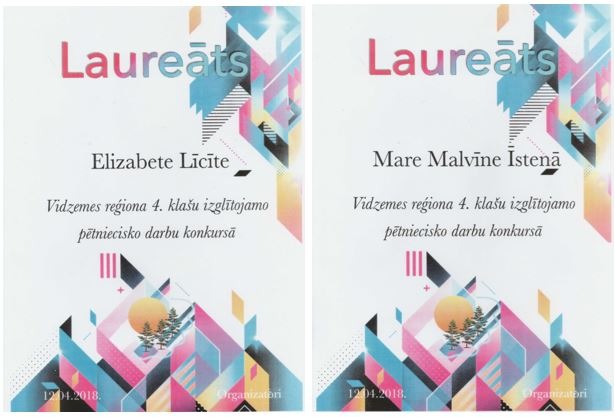 12. aprīlī 4.a klases skolnieces Mare Malvīne Īstenā un Elizabete Līcīte devās uz Valmieru, lai skolēnu pētniecisko darbu konkursā aizstāvētu savu darbu “Atkritumi, to ietekme uz vidi”. Pētniecisko darbu konkursā kopumā tika prezentēts 21 darbs. Šajā konkursā mūsu meitenes guva lieliskus panākumus! Mare un Elizabete kļuva par konkursa laureātēm, kā arī ieguva klausītāju un lasītāju simpātiju!