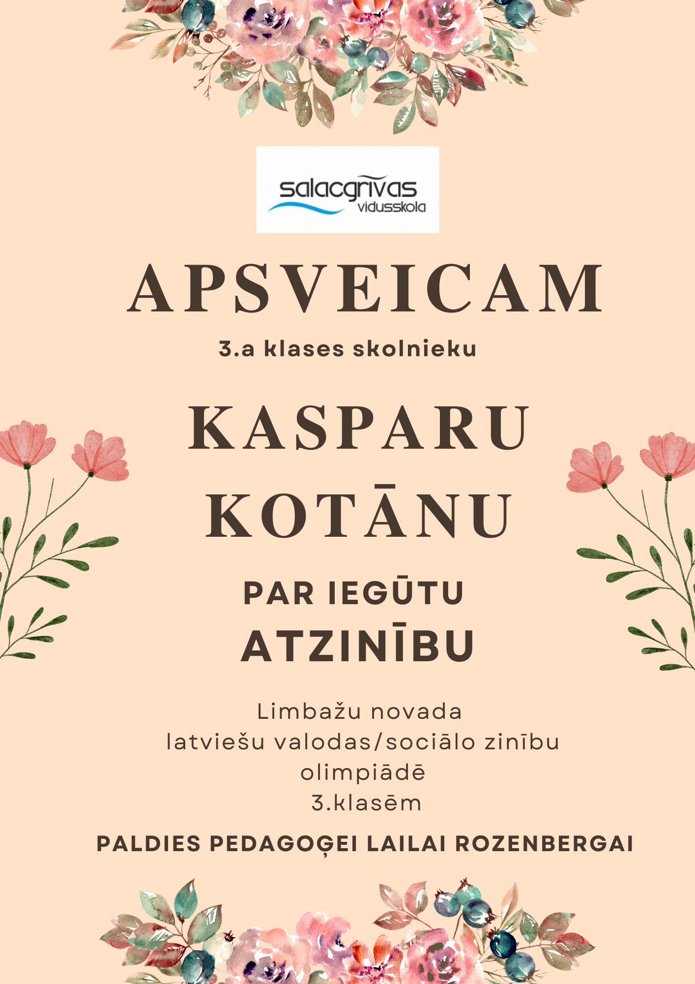 Tāpat priecājamies par 3.a klases skolēnu Kasparu Kotānu, kurš olimpiādē saņēma atzinību par savu sniegumu!