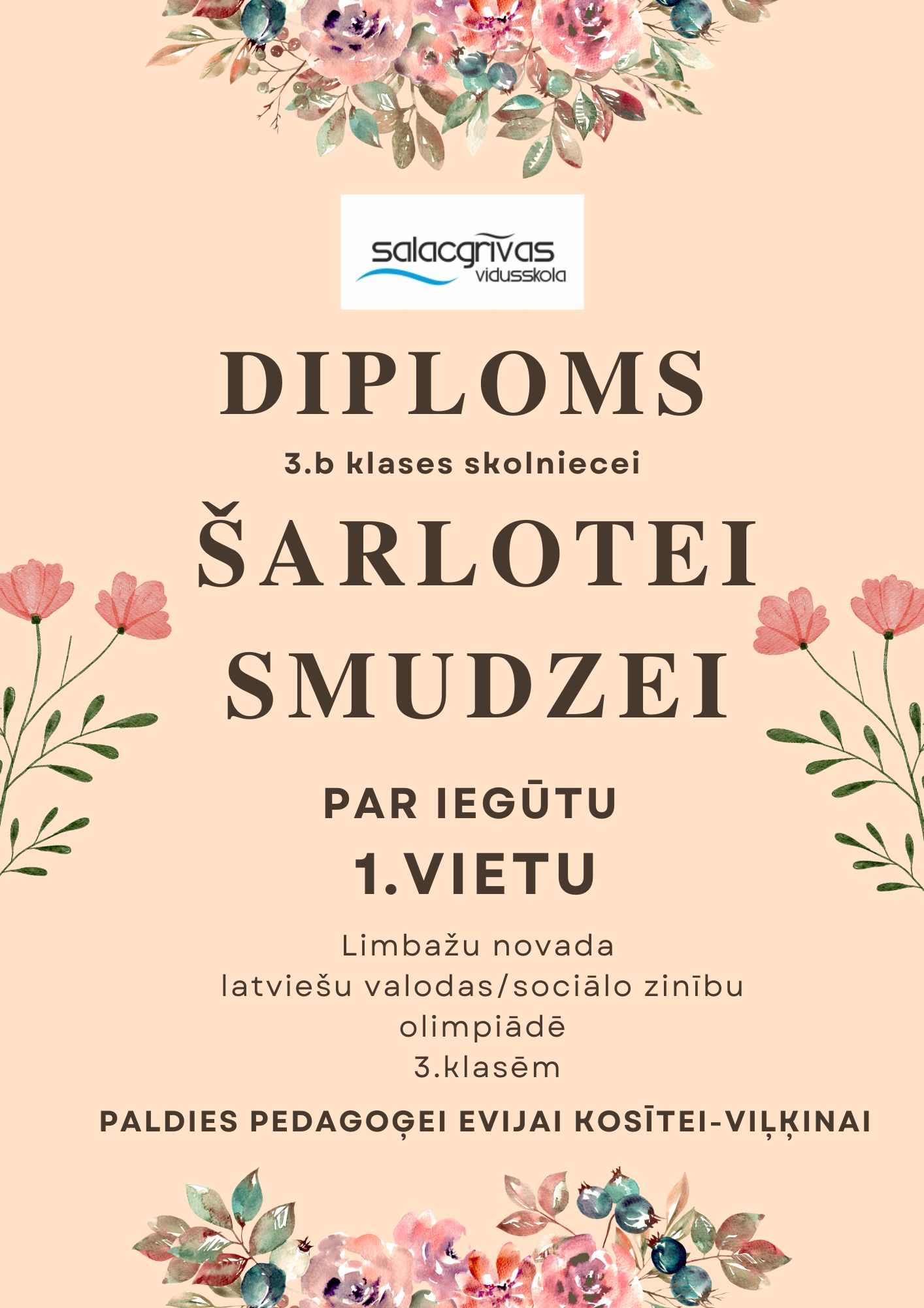 Salacgrīvas vidusskola ar lielu prieku sveic un lepojas ar 3.a klases skolnieci Elīzu Vijupi un 3.b klases skolnieci Šarloti Smudzi, kuras 9. aprīlī ieguva godalgoto 1. vietu Limbažu novada latviešu valodas un sociālo zinību olimpiādē 3. klašu skolēniem!