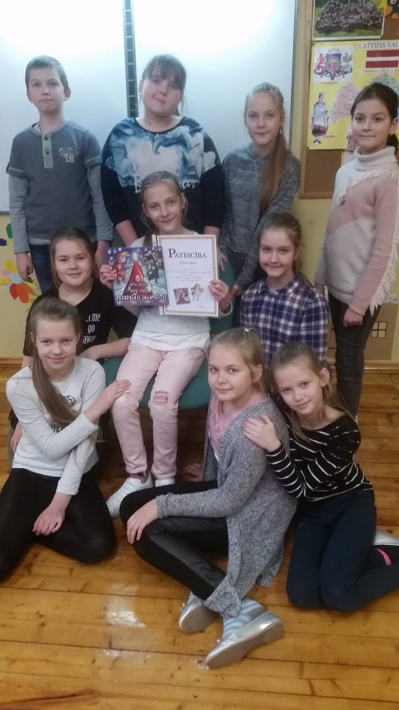 Konkursā piedalījās arī 4.a klases skolēni. Tikai nosūtīti 10 skolēnu  radošie darbi. Prieks bija liels, kad tika saņemta vēstule no Apgāds Zvaigzne ABC, ka Elīza Eglīte ir viena no apbalvotajām un saņem Pateicību un rakstnieces jauno grāmatiņu “Pazudušais Salavecītis”. Klases biedri priecājas kopā ar Elīzi. Arī pārējiem skolēniem bija interesanti darbi.