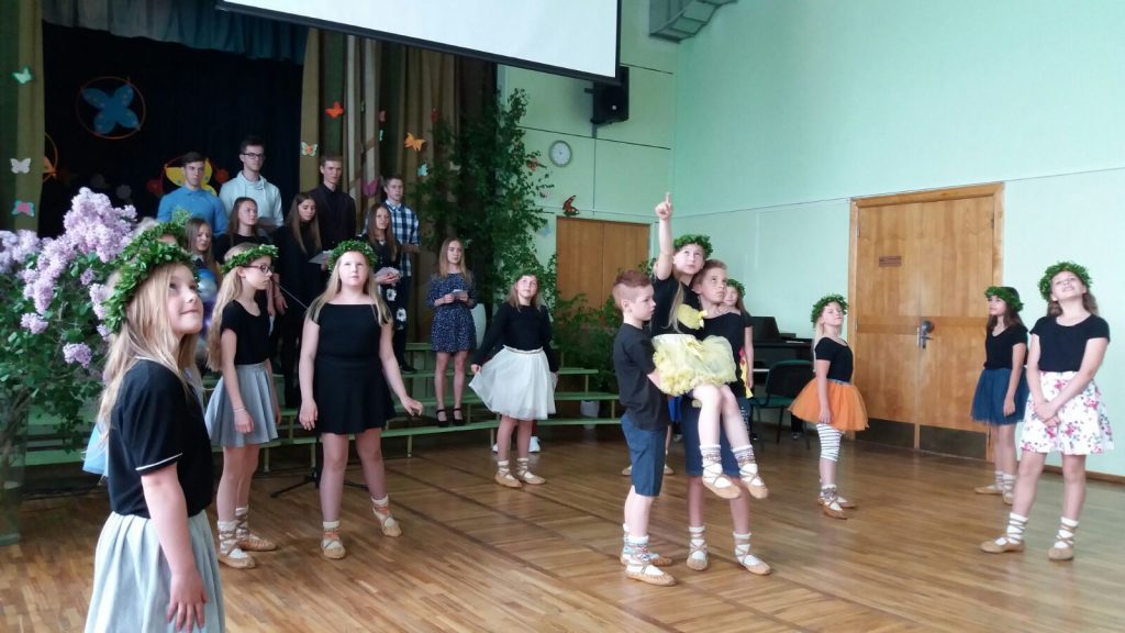 Ar ceriņiem , meijām un taureņiem rotātā zālē , par kuru parūpējās 8.un 11.klašu skolēni, pirmo klašu skolēni ieveda savus lielos draugus – divpadsmitklasniekus, kuriem sekoja 9.klašu skolēni.