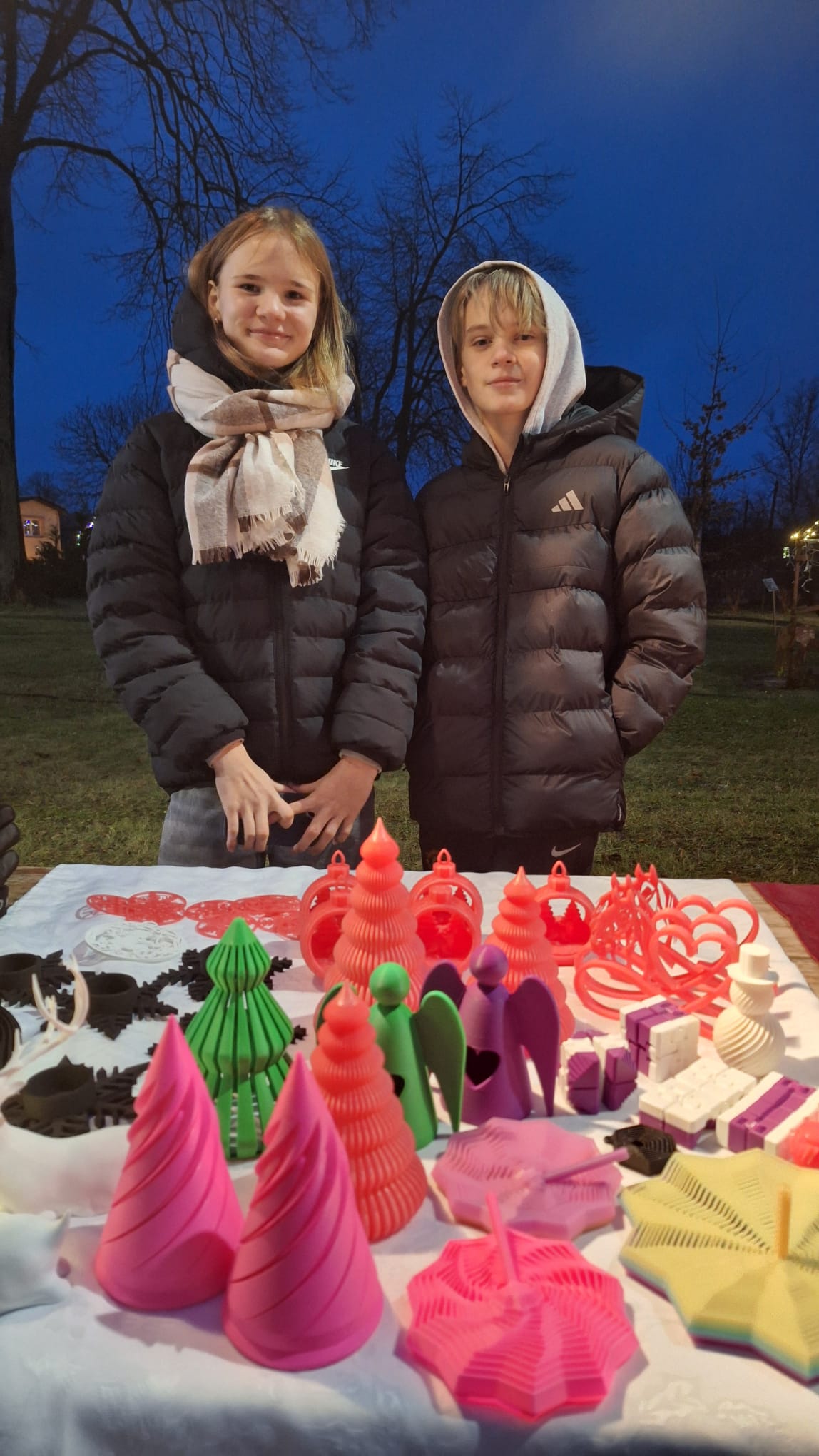 SMU “3D Drukas Studija” – Pēteris Kristers Tomsons (7.a) un Marta Tomsone (6.b) šogad pirmo reizi piedāvāja 3D printētus Ziemssvētku dekorus.