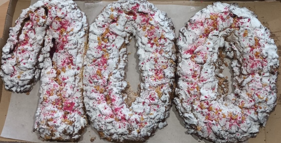 Pārsteigumi turpinājās. Uz skatuves iznāca skolas direktore un kā dāvanu mums pasniedza skaistu svētku kliņģeri – 100. Viņa vēlēja mums būt radošiem, dzīvespriecīgiem, zinātkāriem arī turpmāk.
