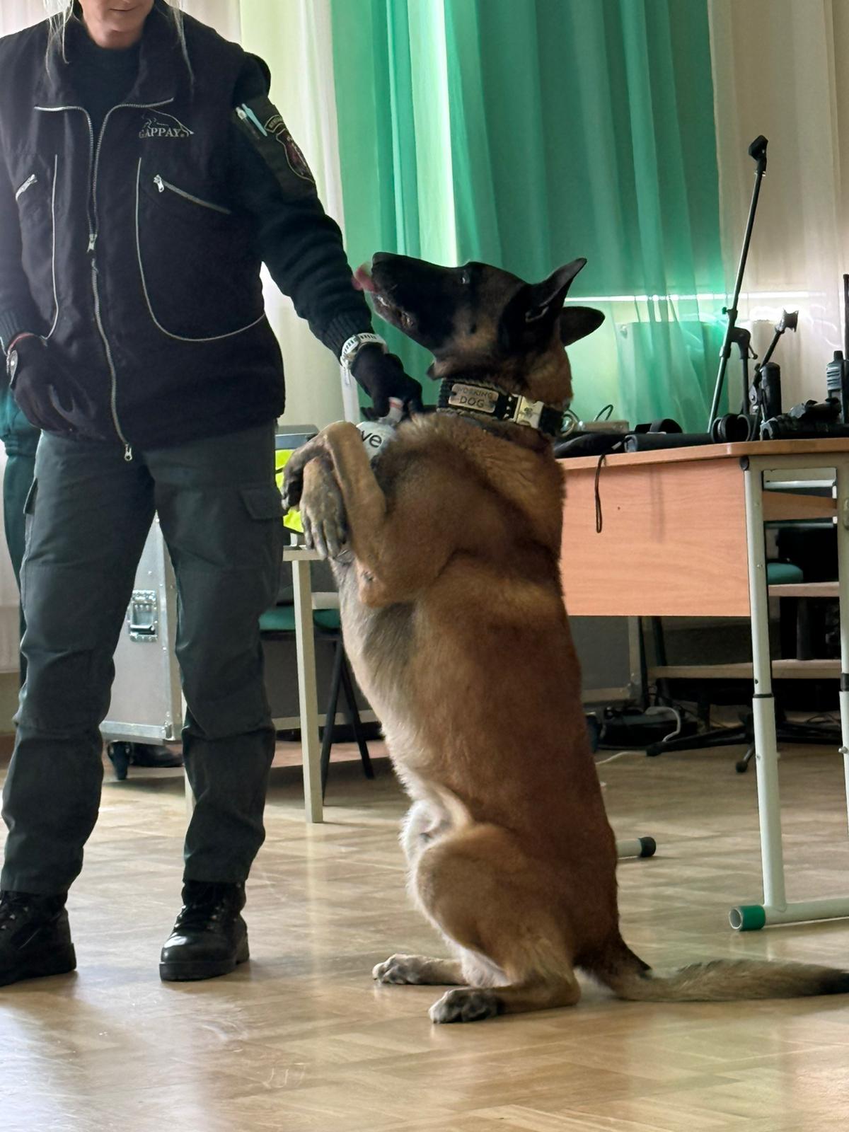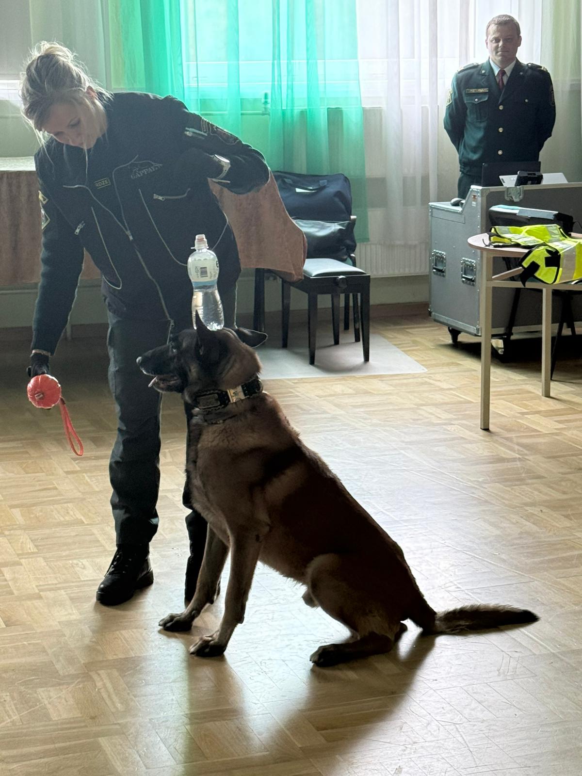 Nobeigumā skolēni tikās ar latvijas Robežsardzes pārstāvjiem un kinologu ar izcili apmācītu beļģu aitusuni (Malinuā).