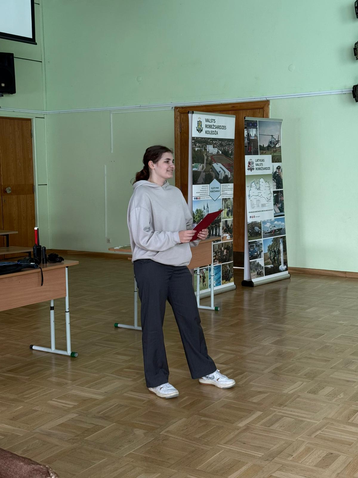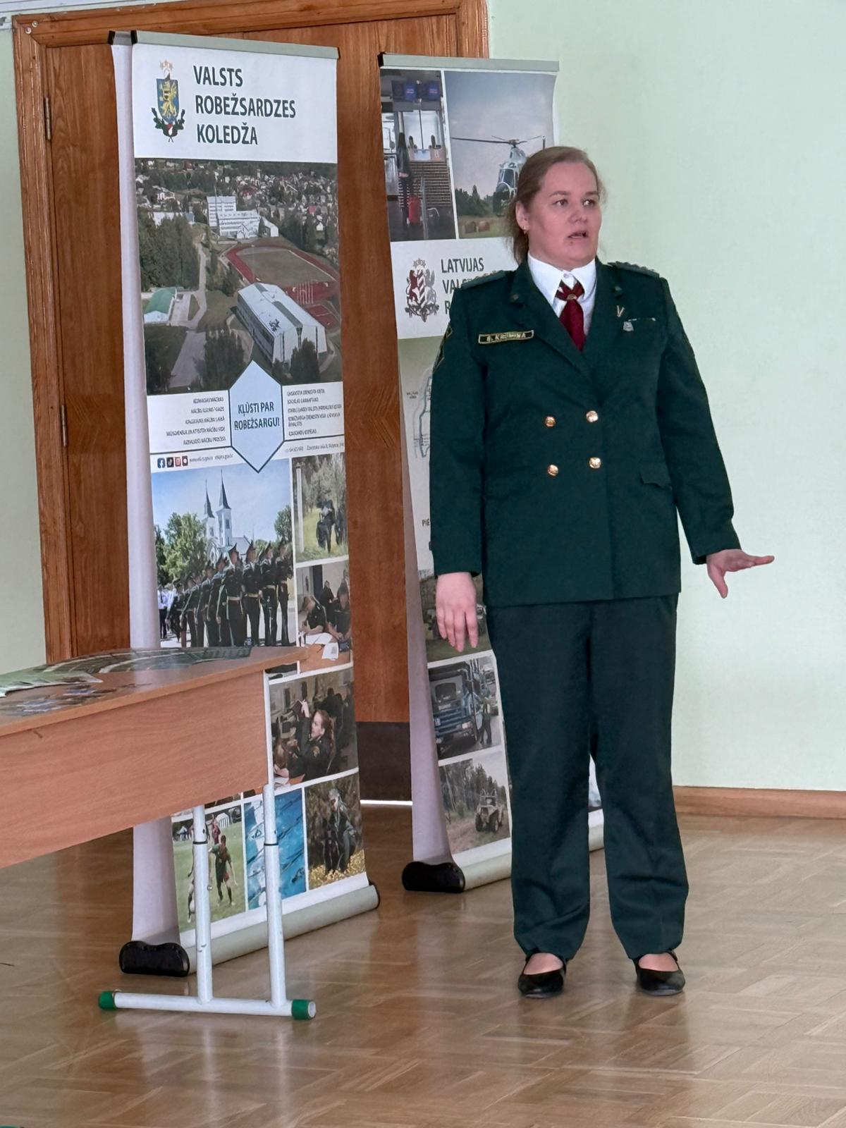 Katru viesi sagaidīja Skolēnu ministrijas jaunieši, kā arī paši pieteica . (Šeit Liene Damsone piesaka robežsardzes speciālistu un kinologu).