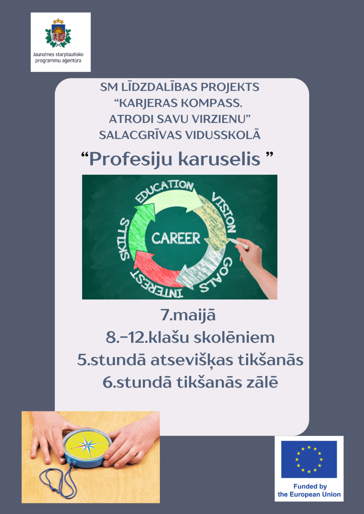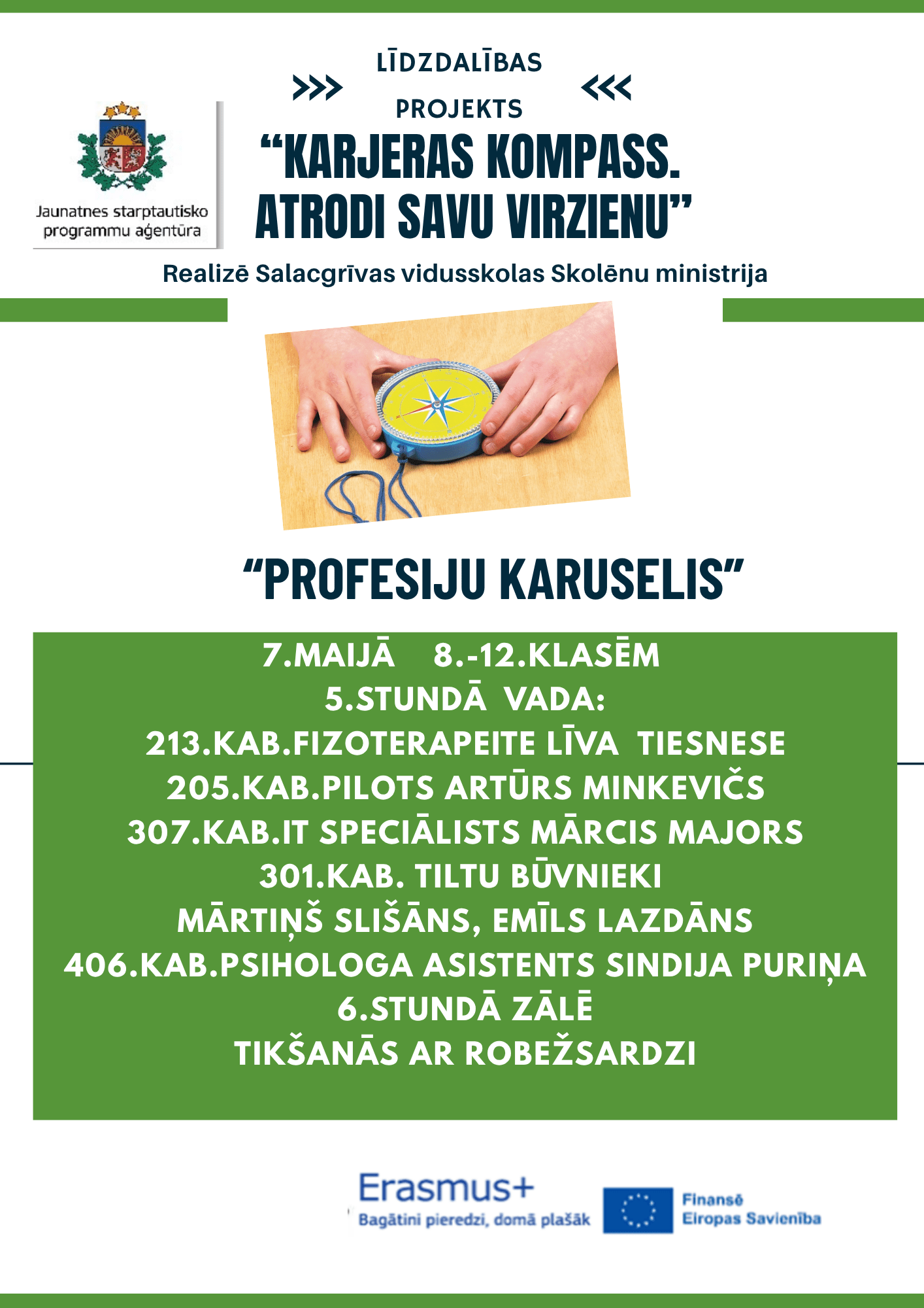 7.maijā Salacgrīvas vidusskolā tika realizēts viens no Jauniešu līdzdalības projekta “Karjeras kompass. Atrodi savu virzienu” pasākumiem – “Profesiju karuselis”. Projekta plānošanas stadijā ilgi domājām, kāds varētu būt šis pasākums. Rezultātā katrs 8.-12.klases skolēns tikās ar trim profesiju pārstāvjiem. Rakstot atsauksmes pēc nodarbībām, skolēni atzina, ka tikšanās klasē mazākā pulciņā ir labāka, jo tad ir vairāk tādi, kas grib uzzināt tieši par šo profesiju, un ir vieglāk uzdot arī savus jautājumus. “Ļoti interesanta, aizraujoša nodarbība, mazā kompānijā bija klusāka nodarbība, jo nebija tik liela runāšana. Visi klausījās, jo bija izvēlējušies noteiktu profesiju, nebija “piespiedu”, raksta viena no klausītājām.