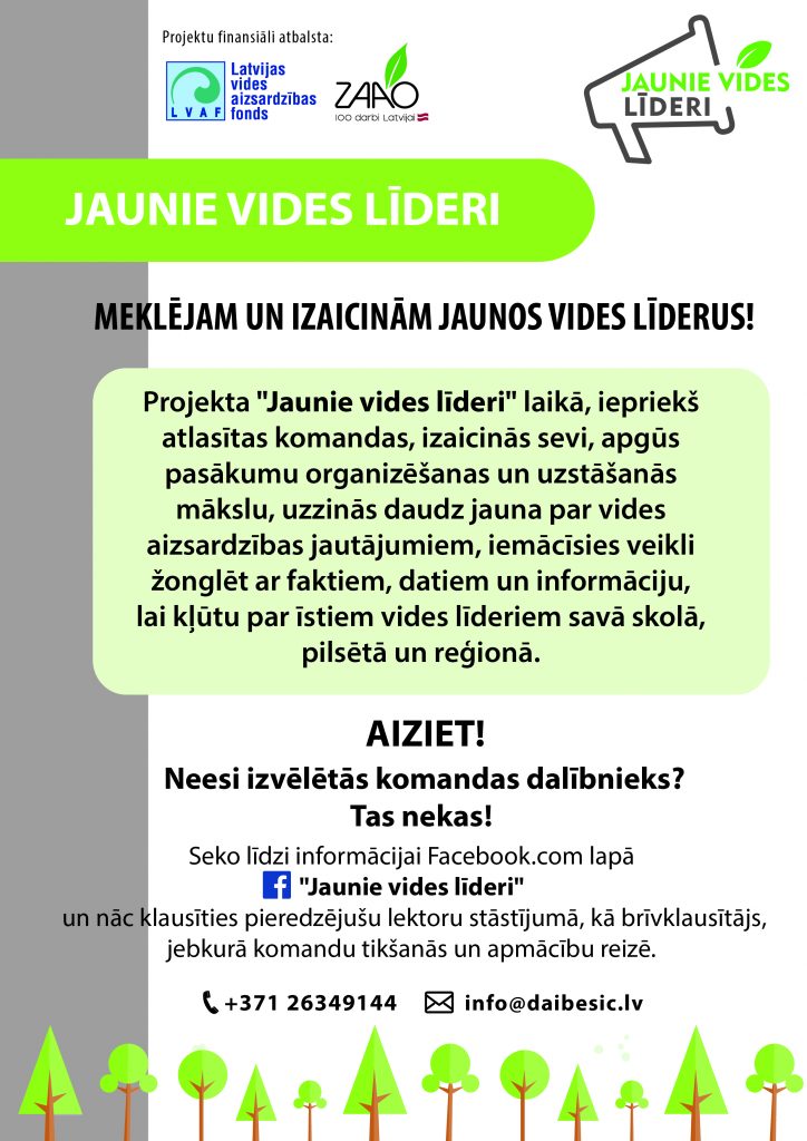 Projekta, vidusskolēniem un pamatskolu pēdējo klašu skolēniem, “Jaunie vides līderi” laikā, caur aizraujošiem uzdevumiem, izaicinājumiem, asām un zaļām sajūtām mācīsim un “slīpēsim” jauno vides līderu prezentāciju sagatavošanas un uzstāšanās prasmes, pasākumu plānošanas un organizēšanas iemaņas, spēju efektīvi “žonglēt” ar faktiem un pārliecinoši iesaistīties debatēs par vides jautājumiem.