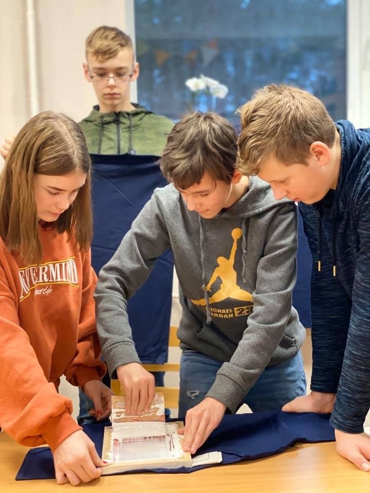 7.b klases skolēni savas klases audzinātājas Līgas Siliņas vadībā mācījās apdrukāt T-kreklus sietspiedes tehnikā.