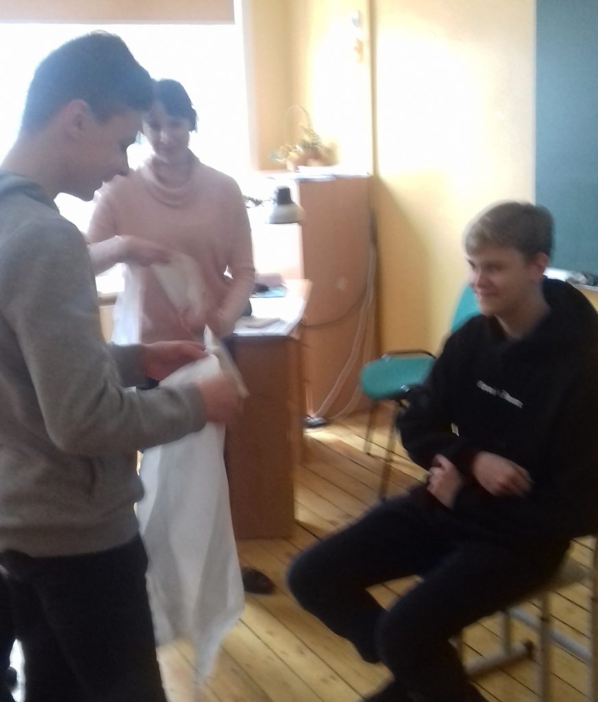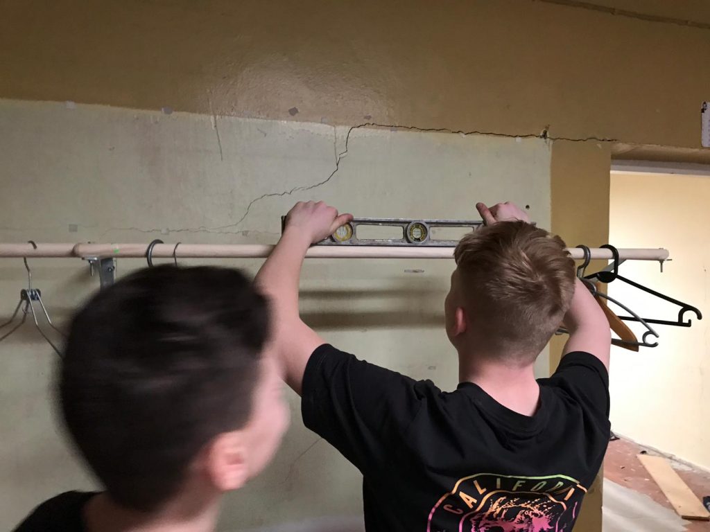 Zēni meistaro tērpu novietni jeb tērpu pakaramo. Pašu pirkti materiāli, tātad ziedojums skolai, liels paldies Mārtiņa Kleina ģimenei.