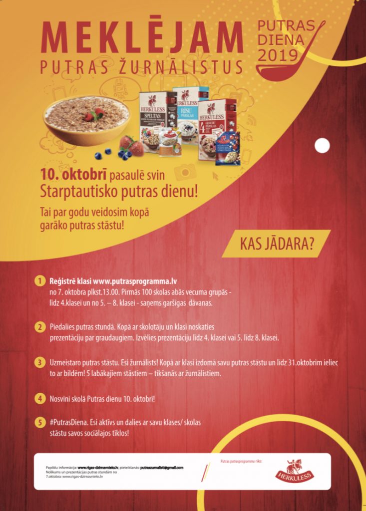 “Mums prieks turpināt ar Jums kopā šo Putras dienas tradīciju – šoreiz, kopīgi baudīsim šo pasākumu iejūtoties Putras žurnālistu lomā! Tāpēc mums palīgā nāks Latvijā populāri žurnālisti ar kuriem labāko darbu autori arī tiksies uz vietas klātienē viņu pārstāvētajos medijos.” Par godu Starptautiskajai Putras dienai AS „Rīgas Dzirnavnieks” un “Herkuless” arī šogad rīko Putras programmu ar izglītojošām un interaktīvām aktivitātēm skolās, lai izglītototu skolēnus un sabiedrību kopumā par graudaugu veselīgumu un putras ēšanas tradīcijām.