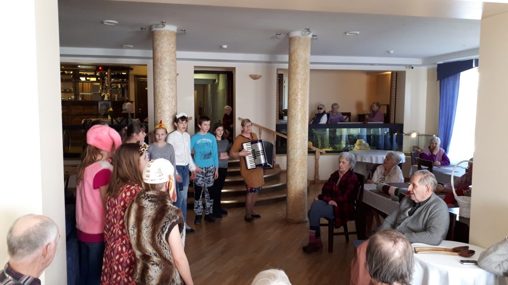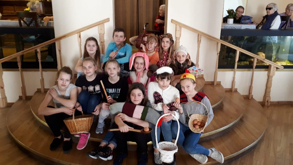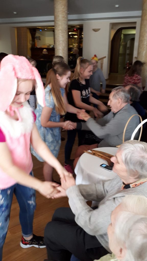 Pasākumā skolēni gāja rotaļās, kuras mīļas senioriem no bērnības: ,,Ādamam bij’ septiņ’ dēl’ “, ,,Es ar savu cisu maisu dancot gāj” “ , ,,Kas dārzā”. Senioriem rotaļāties vairs nav jaudas, bet visi dziedāja līdzi un plaudēja. Dāvanā saņēmām koka darinājumus: dekorus – Lieldienu gaili, dekoratīvu šķīvi un krāsotas oliņas.