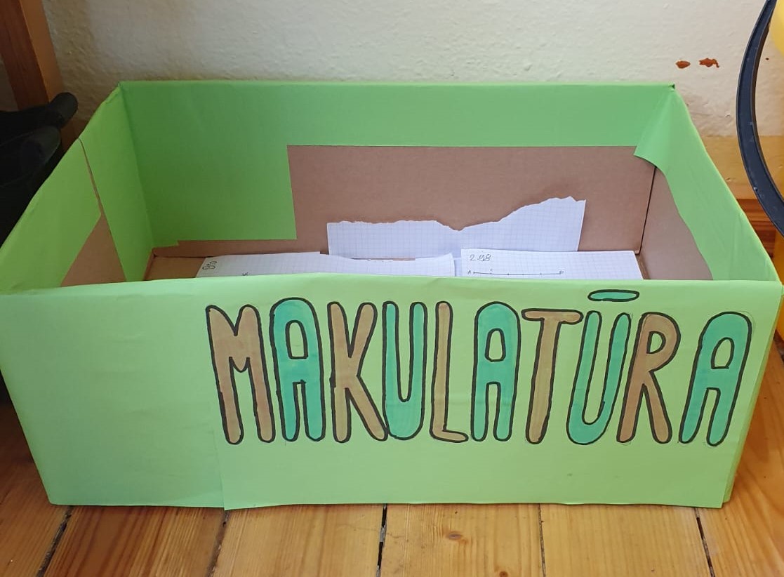 Ekopadomes pārstāves Marta Megija Lielkalne un Jasmīne Majore uzņēmās pārbaudīt vai skolā visos kabinetos ir pieejamas makulatūras kastes, kur tiek likti dažādi papīra atgriezumi. Konstatēja, ka apmēram desmit kabinetos šī kaste nebija, pamatoja, ka nerodoties šādi atkritumi. Bija arī jaunie kolēģi, kuri par to nezināja, tiem meitenes veica izglītojošo piecminūti. Palīdzējām kastes ieviest.