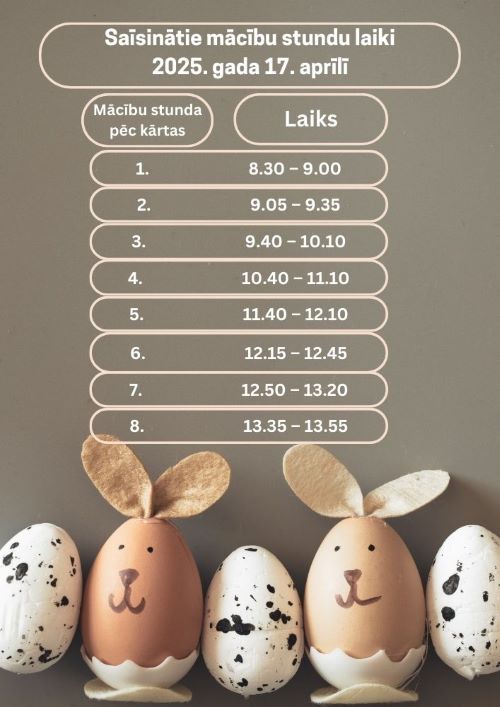 Informējam, ka 2025. gada 17. aprīlī (pirms Lieldienu brīvdienām) Salacgrīvas vidusskolā mācību stundas notiks pēc saīsinātā stundu saraksta.