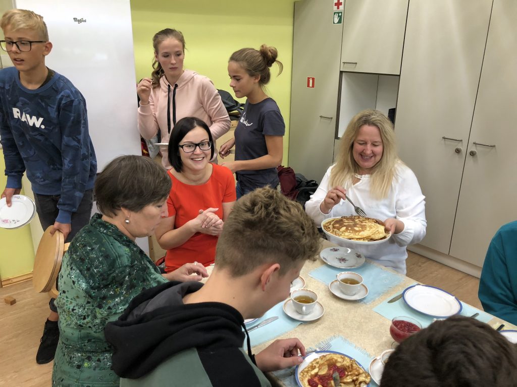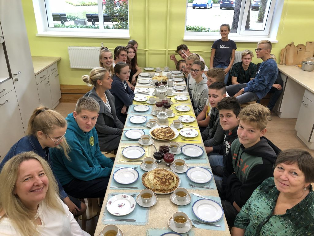 Piektdiena bija pankūku diena- skolotājas Līgas Siliņas prasmīgā vadībā grupa cepa plānās pankūkas. Katrs varēja pielikt savu roku, garšoja labi, arī skolas direktorei. Tad skolēni apmeklēja vienu mācību stundu, bet vienu stundu aktīvi sarunājās angliski – kopā ar skolotāju A.Gromovu-Ķūrenu. Vakars pagāja dažādās aktivitātēs JIC “Bāka”, kur nodarbības vadīja gan pieredzējusi šajā jomā Laura Tiesnese, kā arī mūsu pašu skolnieces.