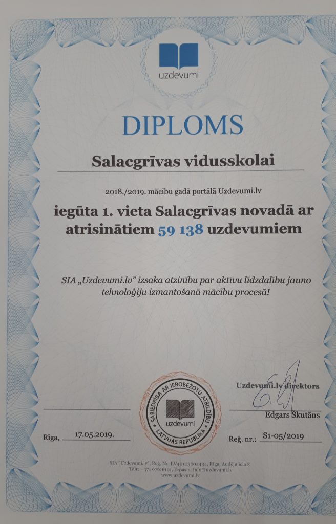 Salacgrīvas vidusskolas skolēni čakli risinājuši, bet skolotāji tikpat čakli uzdevuši digitālos mācību uzdevumus izglītības portālā uzdevumi.lv. Portālā atrisināti 59 138 digitāli uzdevumi.