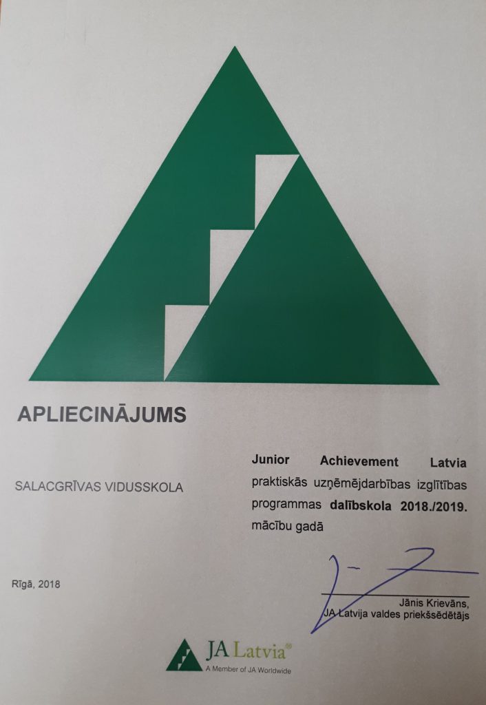 Salacgrīvas vidusskola arī 2018./2019.mācību gadā turpina dalību Junior Achievement Latvia praktiskās uzņēmējdarbības programmā! Ko tas nozīmē? To, ka ikviens jaunietis var doties pie skolotājas Ingas Čekaļinas un uzzināt kā izveidot savu uzņēmumu, lai praktiski apgūtu zināšanas uzņēmējdarbībā. Jaunieši – laiks veidot SAVUS mācību uzņēmumus!