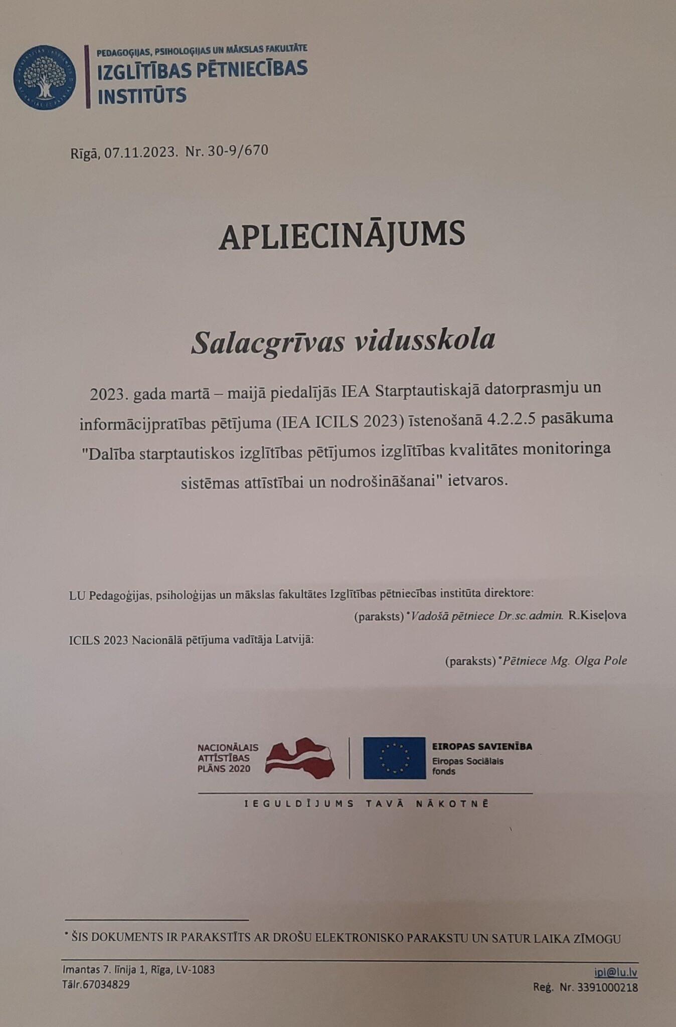 Laika periodā no 2023. gada marta līdz 2023. gada maijam Salacgrīvas vidusskola piedalījās IEA Starptautiskajā datorprasmju un informācijpratības pētījuma (IEA ICILS 2023) īstenošanā. Pētījuma mērķis bija noskaidrot Latvijas izglītojamo IKT prasmes, zināšanas un kompetences. Apkopotie pētījuma rezultāti tiks paziņoti 2024. gadā.