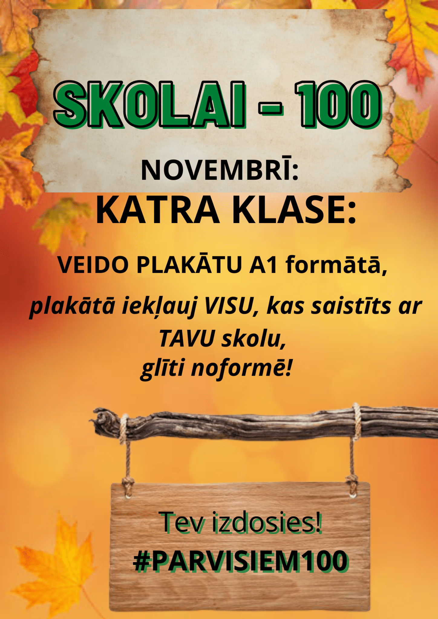 TREŠĀ AKTIVITĀTE, uzsākot novembra mēnesi. Klātienes mācību laikā 5. – 12. klašu skolēnu pārstāvji izlozēja tēmu, kura jāiekļauj gatavojot plakātu, par godu skolas simtgadei.