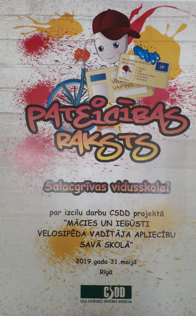 Dalāmies priekā par Salacgrīvas vidusskolas saņemto CSDD pateicības rakstu! Paldies Intai Ciršai par ieguldīto darbu.