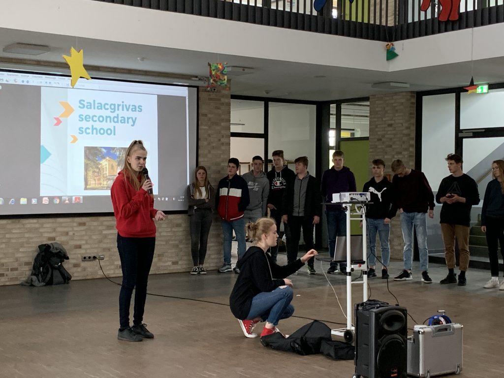 Pēc nodarbībām prezentējām Salacgrīvu un savu skolu vācu skolas astotajām klasēm, jo viņi ir nākamā gada viesi Salacgrīvā, bet pirms tam šiem skolēniem ir jāiztur konkurss – jāraksta radošais darbs un jāsniedz intervija, kāpēc vēlas piedalīties šajā projektā. Prieks skatīties un klausīties mūsu skolēnos – atraisīts, brīvs stāstījums labā angļu valodā, pašu gatavota prezentācija, kurā iekļautas fotogrāfijas no rudens, kad vācu bērni bija pie mums, dažas izraisīja lielu jautrību.