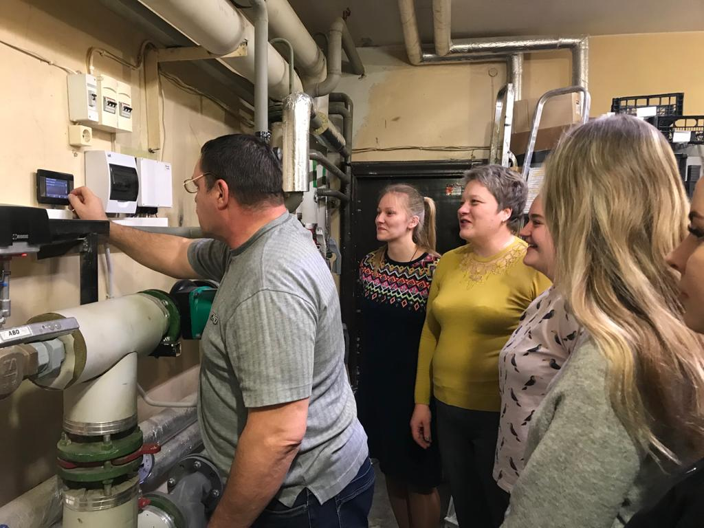 Šai attēlā redzams, kā skolas saimnieks, klātesot dažiem Ekoskolas dalībniekiem, samazina siltuma grādus.