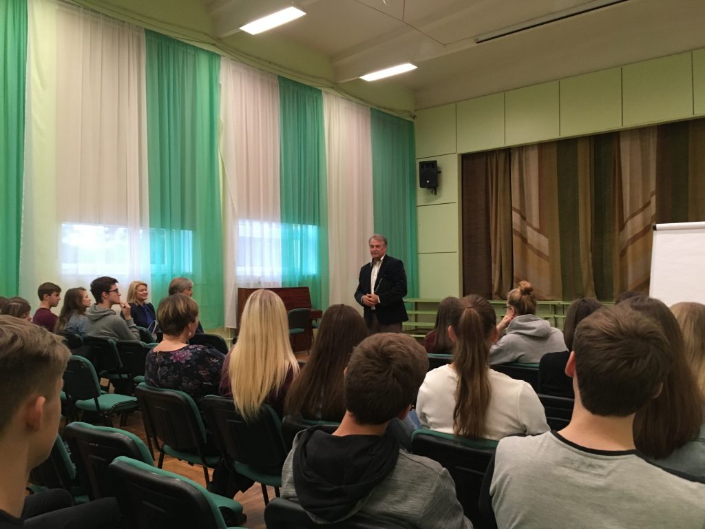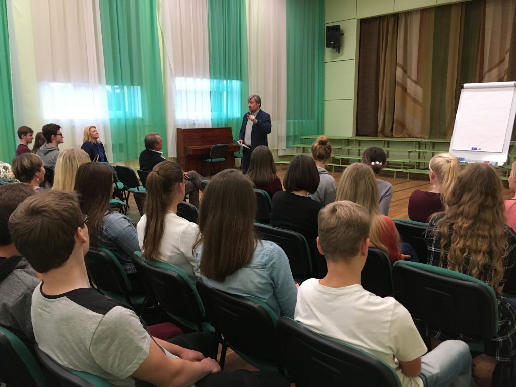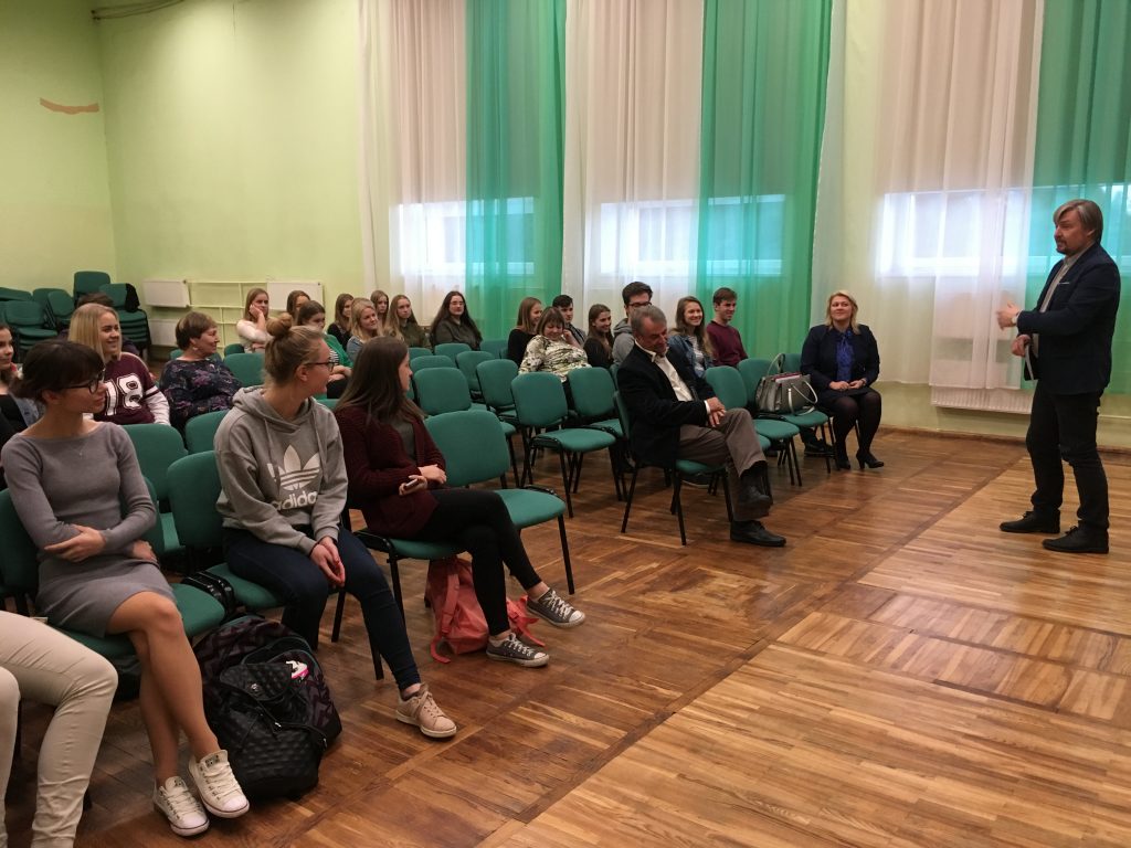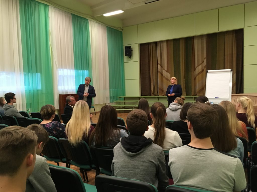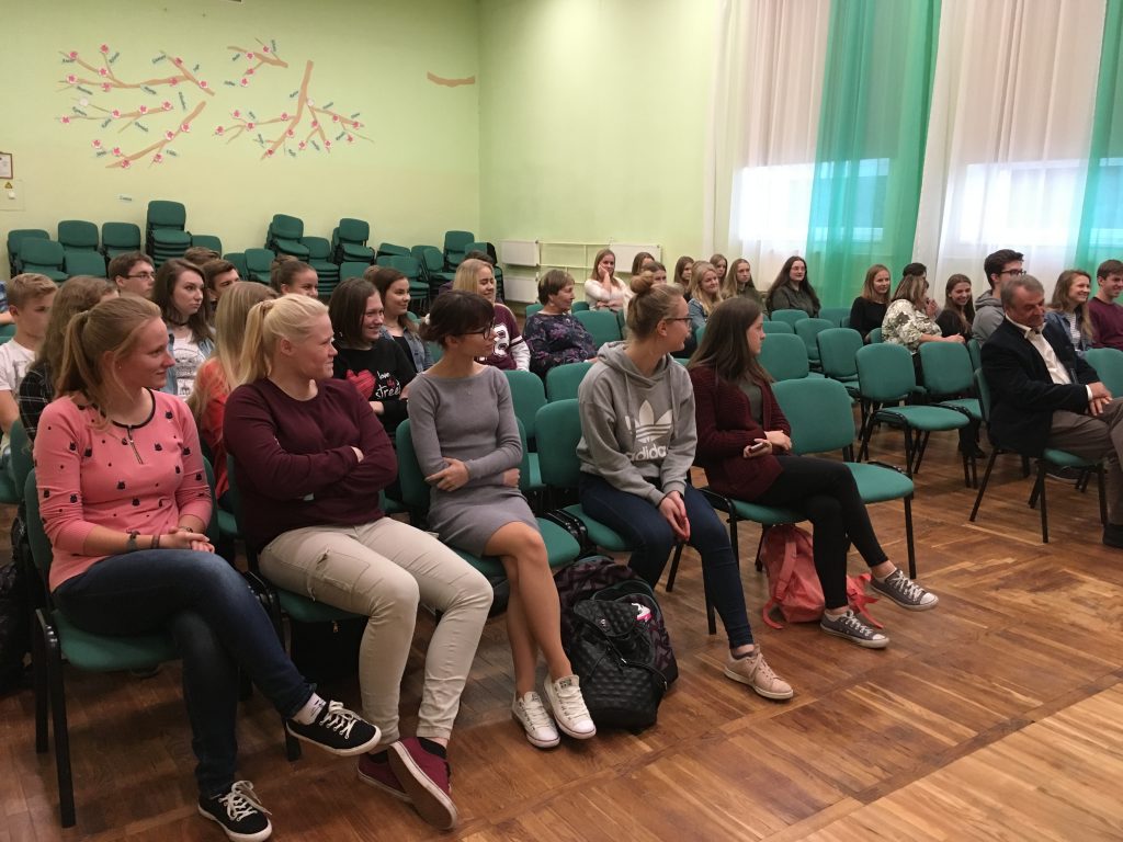 Arī Salacgrīvas vidusskolā 30.oktobra klases stundā zālē pulcējās skolas 10.-12.klašu skolēni, lai tiktos ar Salacgrīvas novada domes priekšsēdētāju Dagni Straubergu, viņa vietnieku attīstības jautājumos Jāni Cīruli, vietnieci izglītības, kultūras un sporta jautājumos Eviju Keiseli.