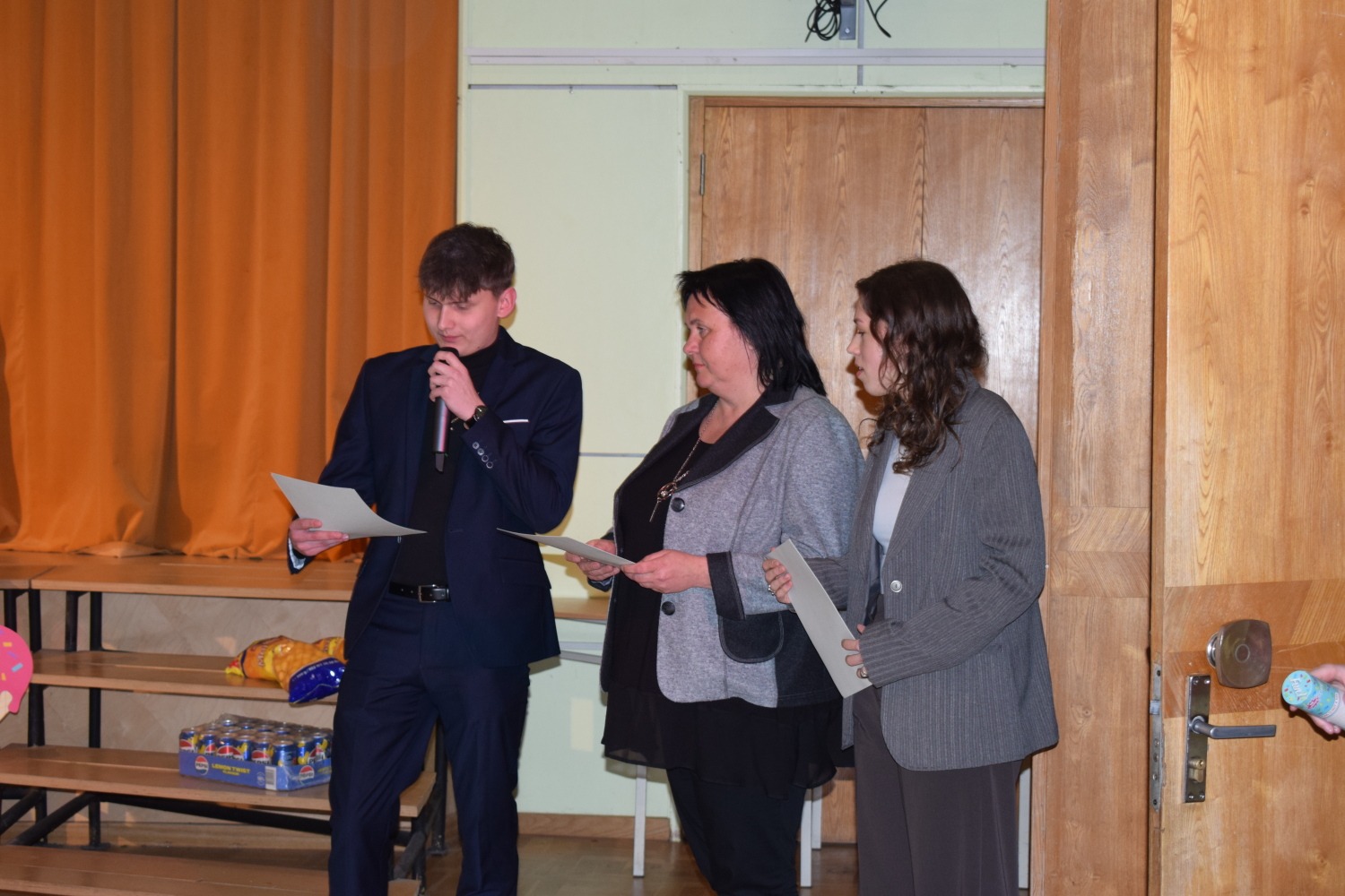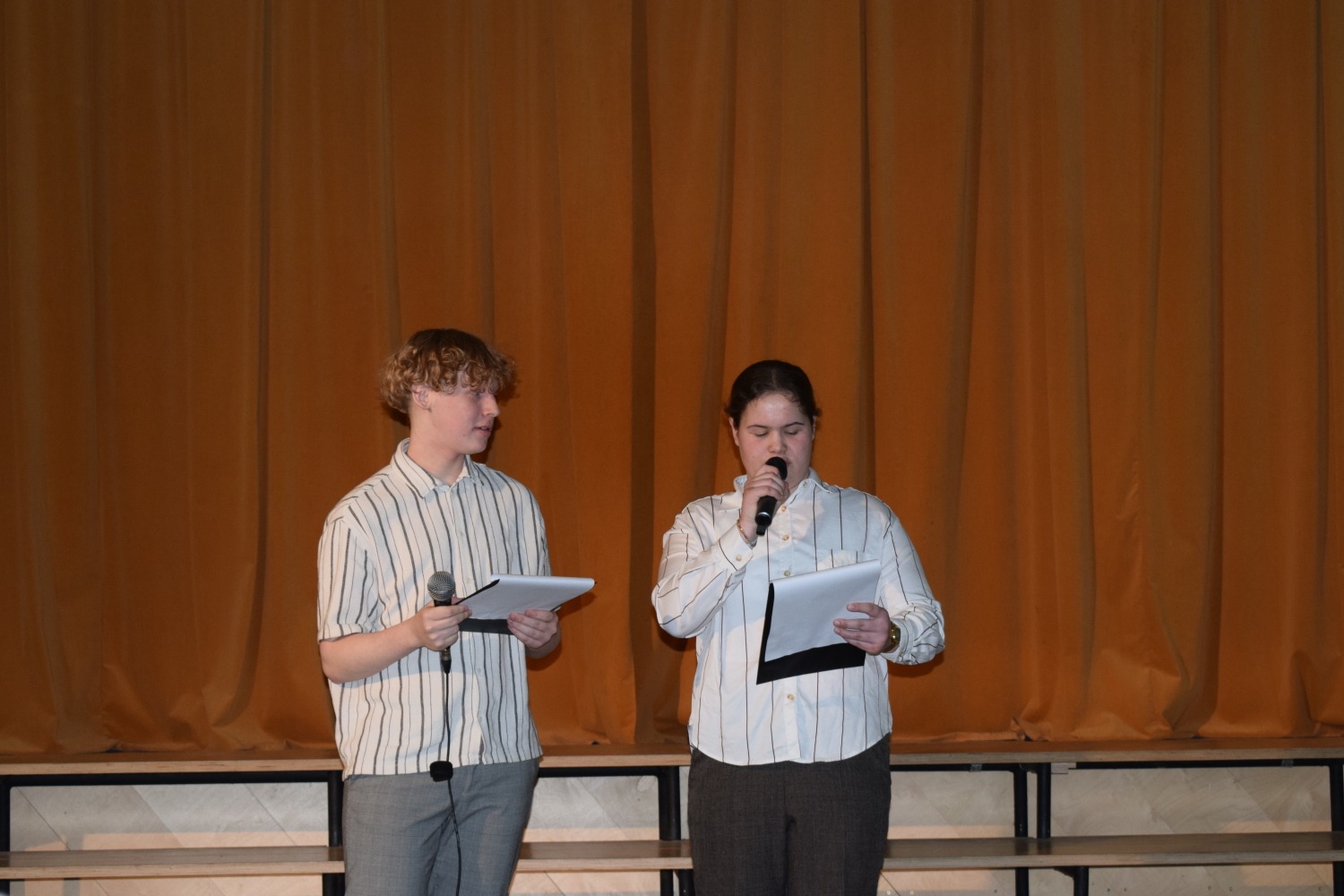 Priekšnesumus pieteica Katrīna Puriņa(8.b) un Gustavs Žibals (9.b). Darot to pirmo reizi tik atbildīgā pasākumā, abi labi tika galā ar šo uzdevumu. (Paldies scenārija gatavotājai Dagnijai Kukai !).