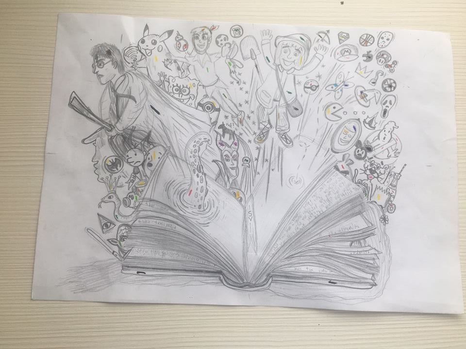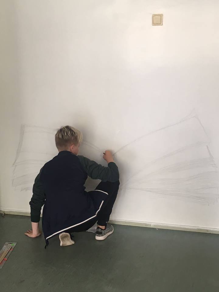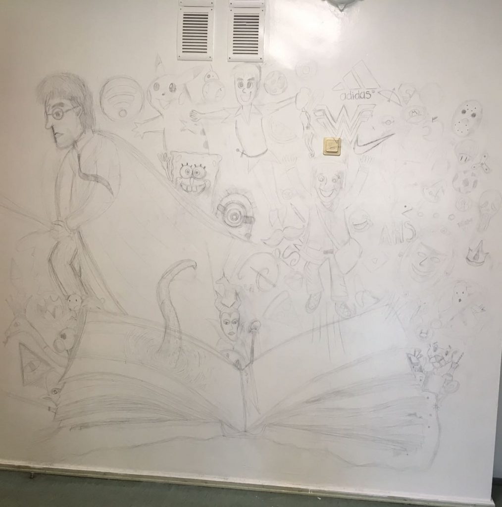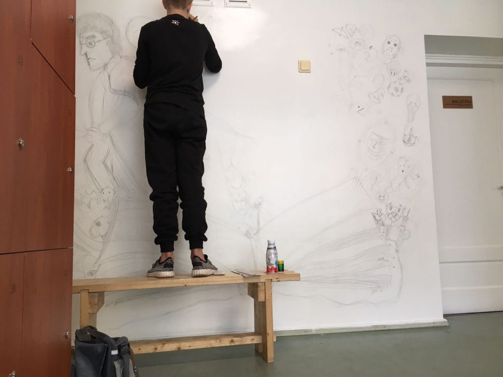 Iepriekšējā mācību gada beigās mēs – Rihards Lūsis, Keita Irmeja un Saule Ķūrena – uzzinājām par iespēju apzīmēt brīvo sienu pie Salacgrīvas vidusskolas bibliotēkas durvīm. Domājot, ka šī būs lieliska iespēja atstāt kaut ko skolai no mūsu puses, mēs piekritām. Neilgi pēc vasaras sākuma Rihards sāka skicēt idejas, kuras varētu atainot uz sienas.