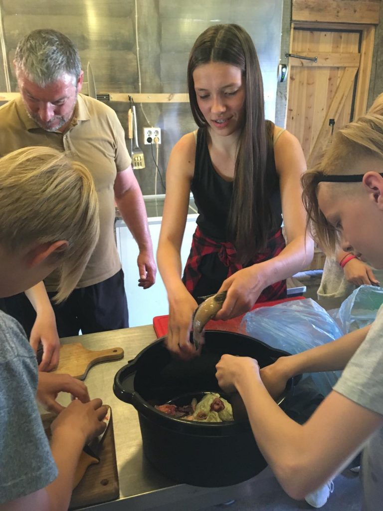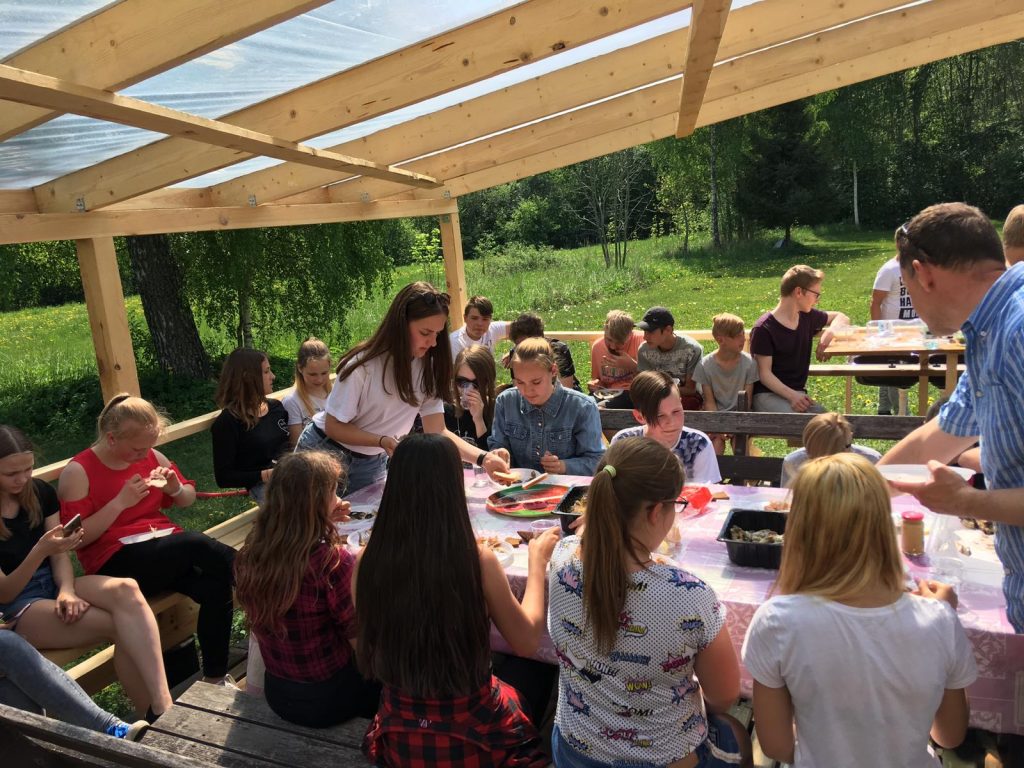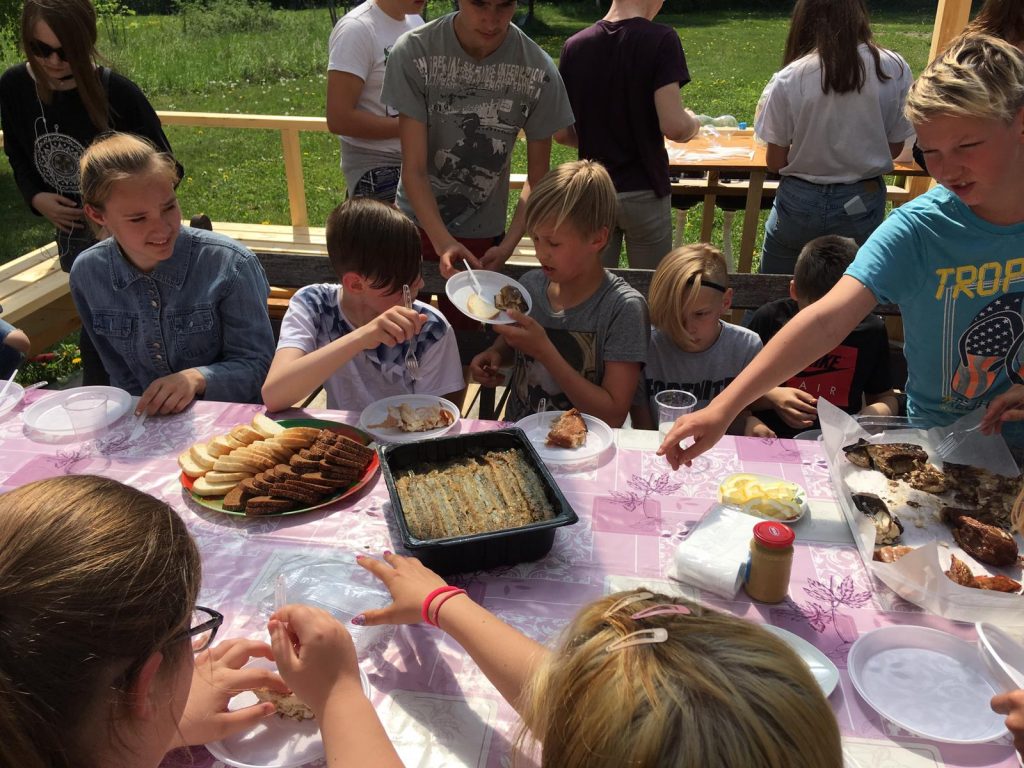 Bija vējzivs šašliks,ko arī daudzi nekad nebija garšojuši,kūpinātas dažādas zivis,arī cepti nēģi , kā arī saimnieks bija uzvārījis  zivju zupu-skolēniem un skolotājiem viss ļoti garšoja:)