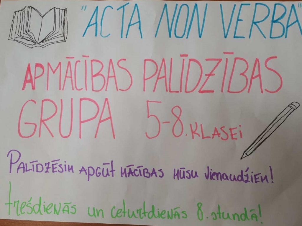 8.klašu skolēni: Diāna Zmičerevska, Ance Andersone un Niks Jakovickis, šogad nolēma dibināt apmācības palīdzības grupu “Acta non verba” 5.-8. klašu skolēniem, lai palīdzētu vienaudžiem apgūt mācību vielu. Apmācības palīdzības grupas nosaukums “Acta non verba“ netika izvēlēts tikai dēļ mūsu entuziasma pret valodām. Tulkojumā no latīņu valodas tas nozīmē: “Darbības, nevis vārdi “, un tas ir tieši mūsu lauciņš. Mēs rīkojamies, nevis tikai stāstam, ko vēlētos izdarīt, jo bez darbiem nebūs sasniegumu.