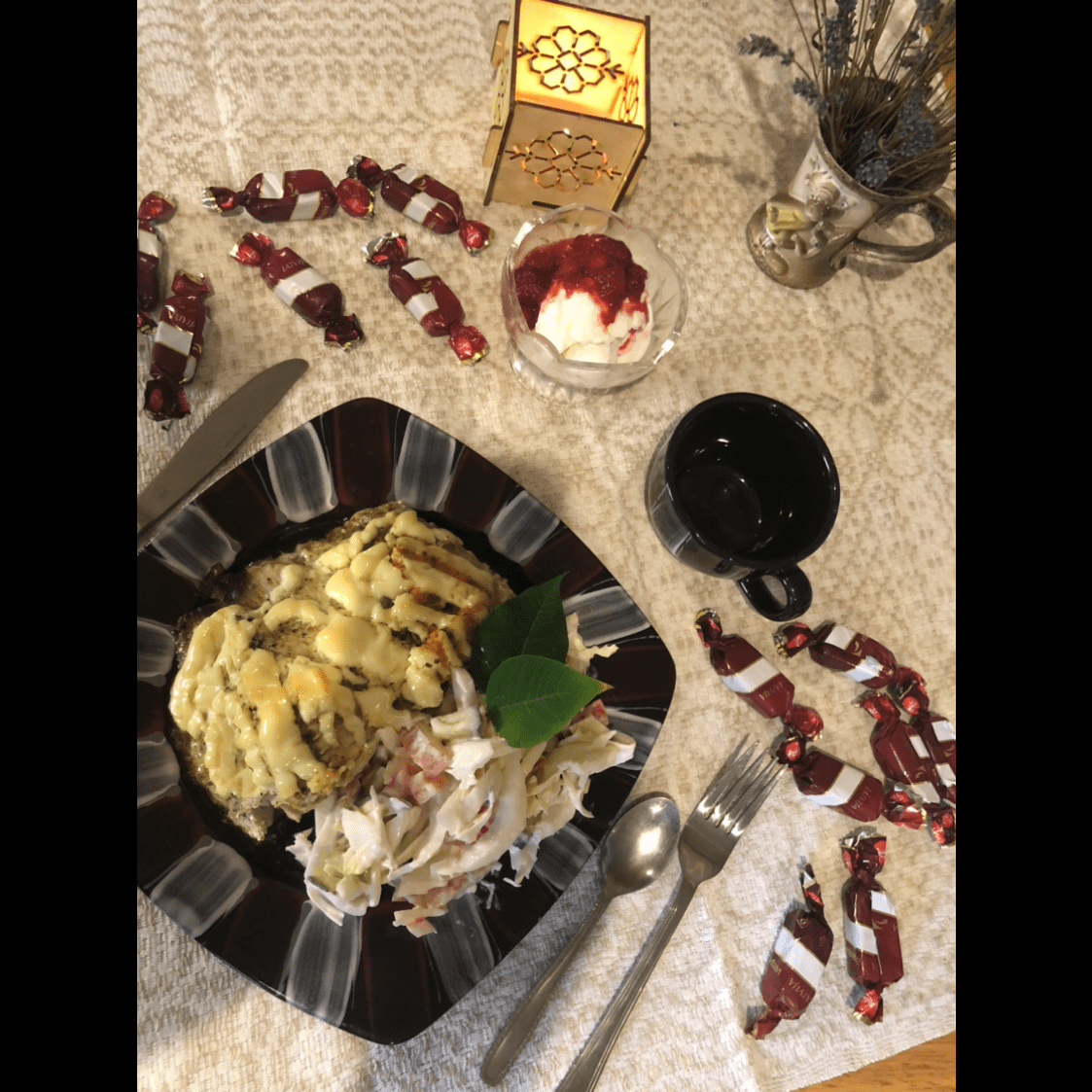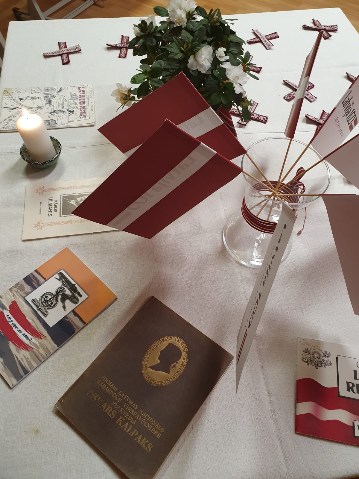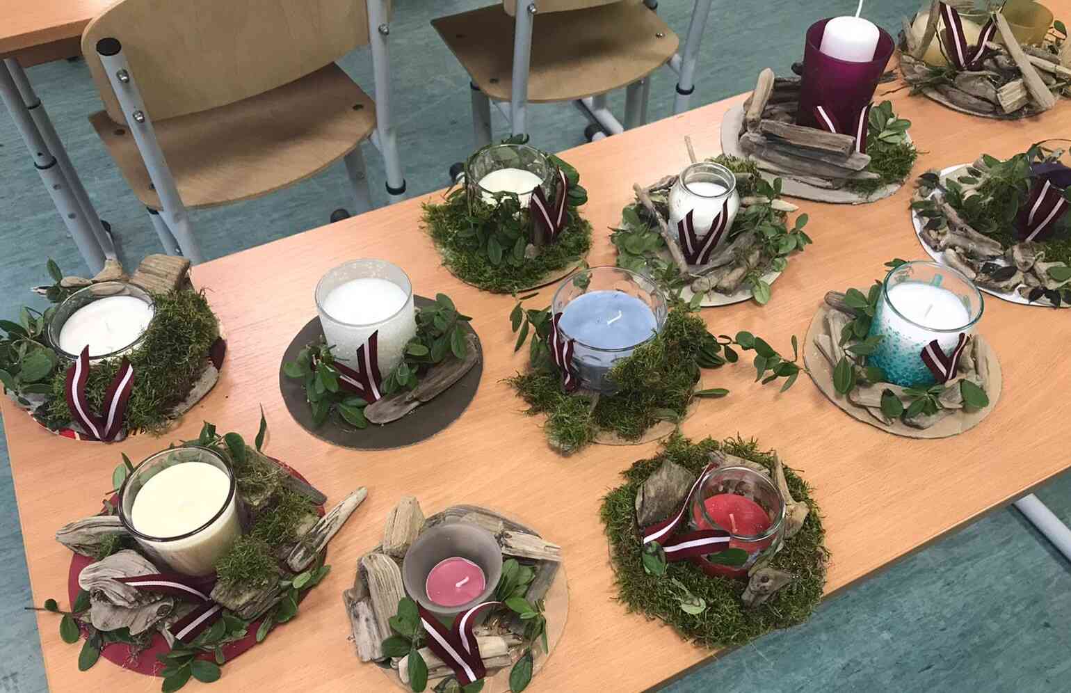 8.b savās mājās sarūpēja svētku galda noformējumu valsts karoga krāsās. Galda rotājumam izmantoja mūžzaļu augu kompozīcijas.