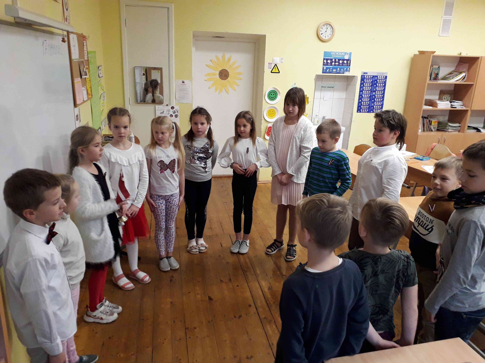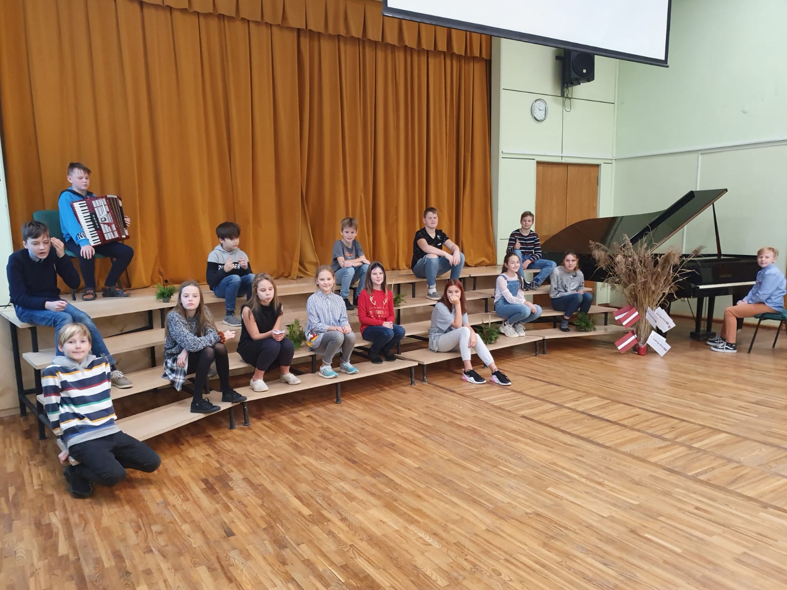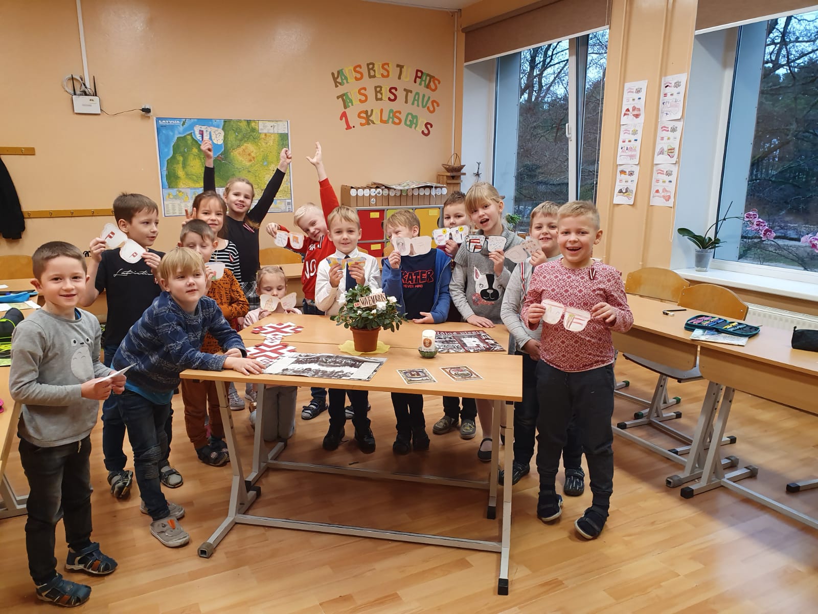 1.a klasei bija uzdevums iemācīties himnu, bet pirms kopīgas dziedāšanas kopīgi noskaidroja, kā jāuzvedas, dziedot šo Latvijai tik svarīgo dziesmu. Bija prieks klausīties, ko bērni nosauc, atbildot uz jautājumu- ar ko tu lepojies- ģimeni, draugiem, dabu, valodu. Skolēni noklausījās dziesmu “Cielaviņa”, saklausot, kādi novadi tiek pieminēti, atceroties arī, ka cielava ir Latvijas nacionālais putns. Vislabāk skolēniem patika dziesma “Mazs bij’ tēva novadiņis”, kuru klausoties, bija jāsaliek kartītes pareizā secībā (skolēni uzmanīgi klausījās dziesmās, kuras dziedāja klases audzinātāja Laura Eimane un skolotāja Inta Cirša).