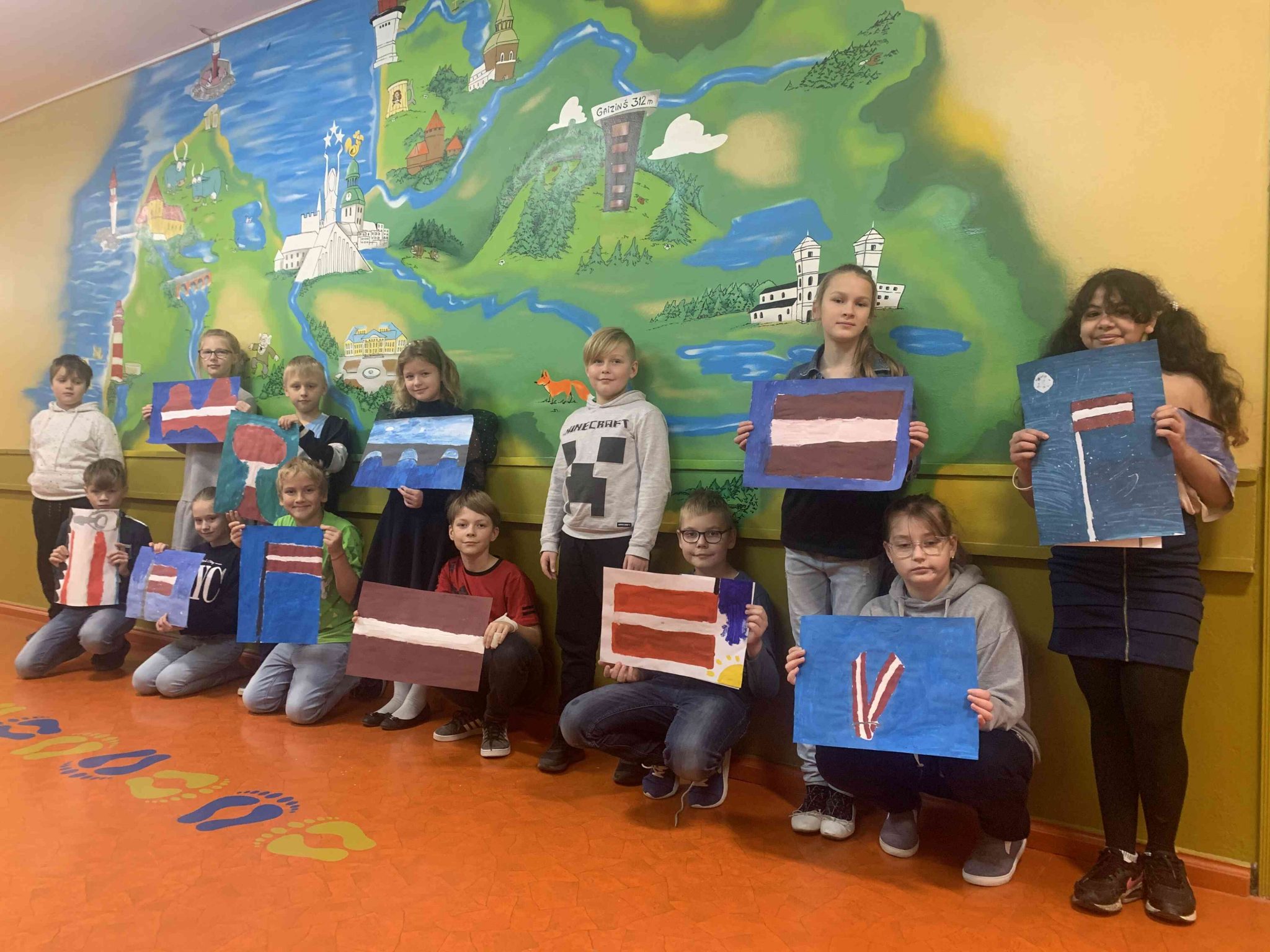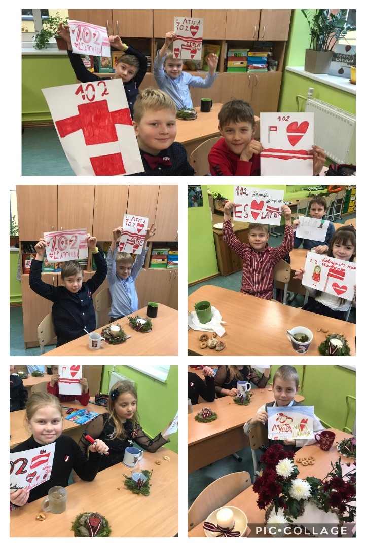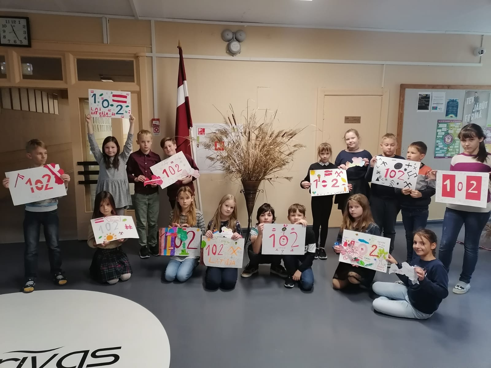 3.b klase sāka stundu, noskatoties filmu “Karoga stāsts”, jo Latvijas valsts karogs ir Latvijas Republikas simbols. Skolēni uzzināja, cik senas ir sarkanbaltsarkanā karoga saknes, ko tas pieredzējis un kāpēc simbolizē valsts brīvību. Pēc tam katrs skolēns pastāstīja, ko viņam nozīmē Latvija, ko zīmēja apsveikuma plakātā – “Latvijai 102”. Skolēniem Latvija ir viņu senči, ģimene, himna, vēsture, latviešu valoda, mežs, Mārtiņdiena, Lāčplēša diena, latvju ornamenti. Kā raksta Kristiāna Reiziņa – “Tā ir skaista un plaša. Sargā to, lūdzu!”