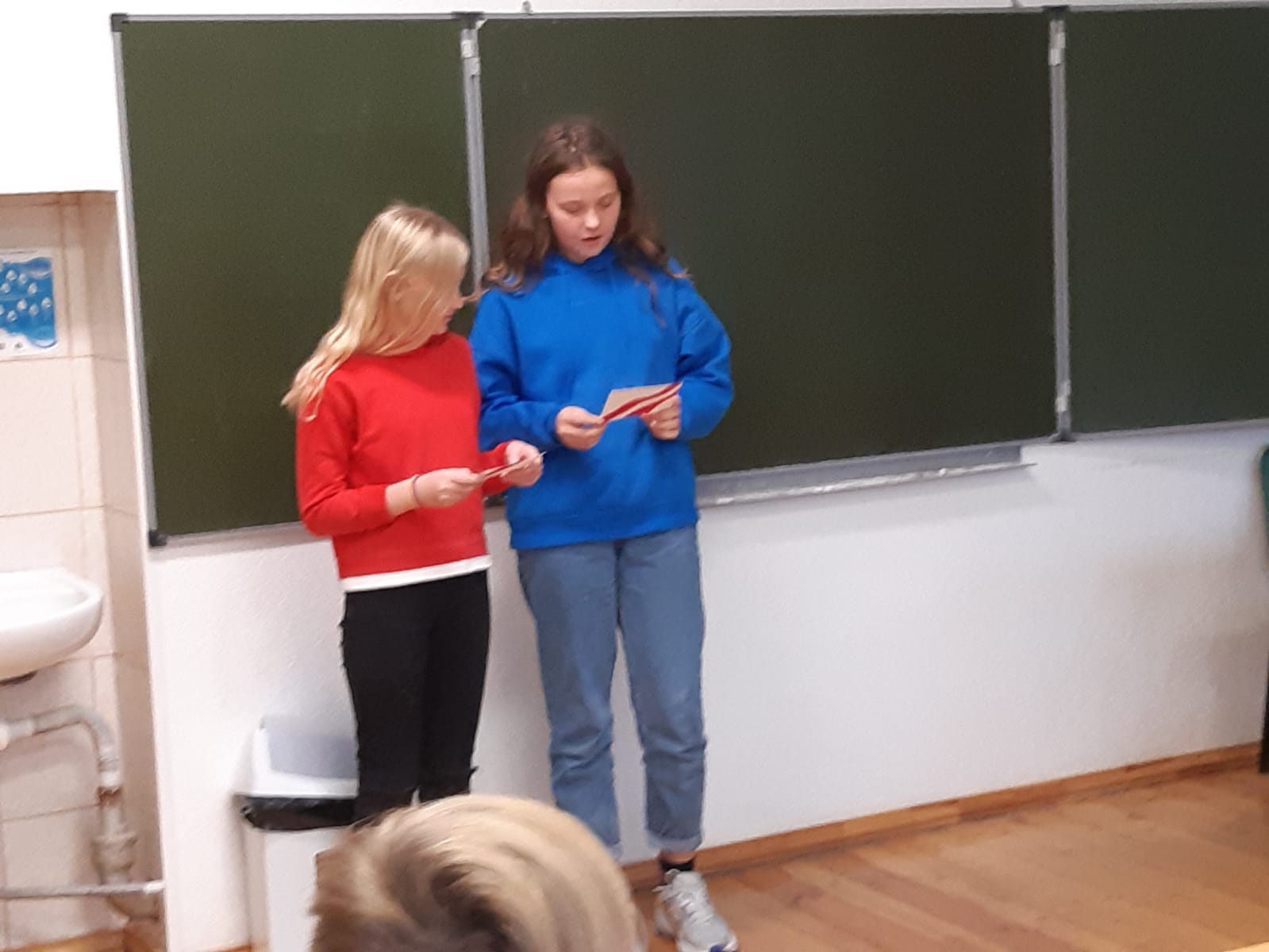 5.b klase bija sagatavojusi svētku koncertu 1.b klasei, katrs bija izvēlējies dzejoli, daži bija sacerējuši paši. Visus ar dzejoli uzrunāja klases audzinātāja Vineta Dance. Dzeju papildināja muzikālie priekšnesumi – spēlēja gan 5., gan 1.klases skolēni.