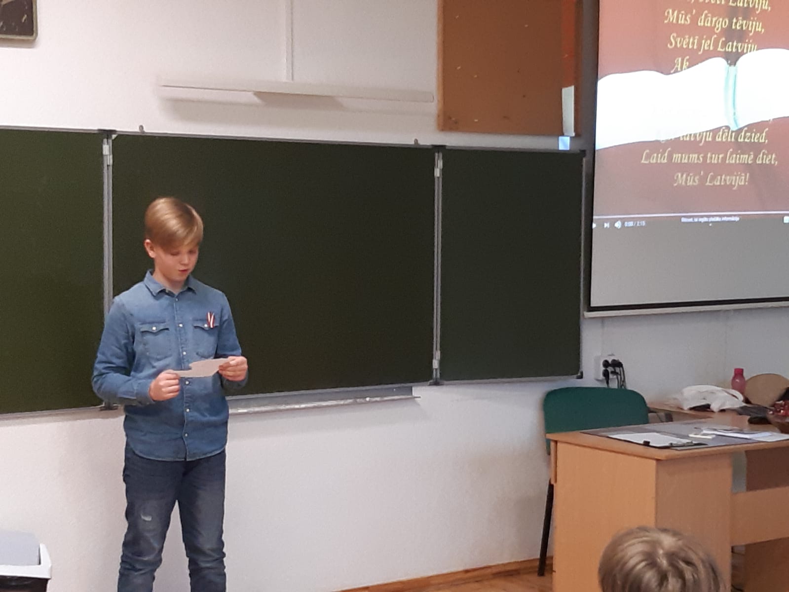 10.klases skolēni attālināti dalījās ar kādu sev tīkamu un patriotisku dzejoli. Klases audzinātāja Ilze Saklaure skolēniem pastāstīja par vārdu latvietis, latvis, minot piemēru par Vecā Stendera kapakmens plāksni uz kura ir rakstīts: “Sche aprakts G.F.Stenders LATWIS (Šeit aprakts G.F.Stenders LATVIS)(kas ir pirmo reizi šādi minēts), kā arī K. Valdemāru, kurš 19.gs. vidū, studējot Tērbatas universitātē, pie savām studenta istabas durvīm ar lepnumu piestiprināja vizītkarti ar piebildi “latvietis”.