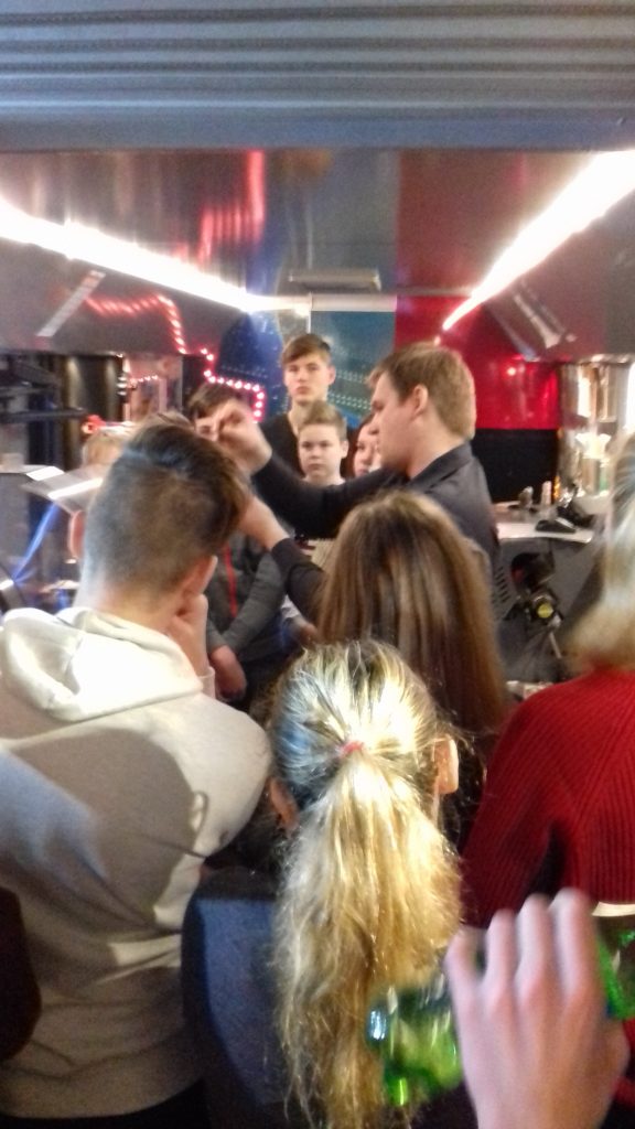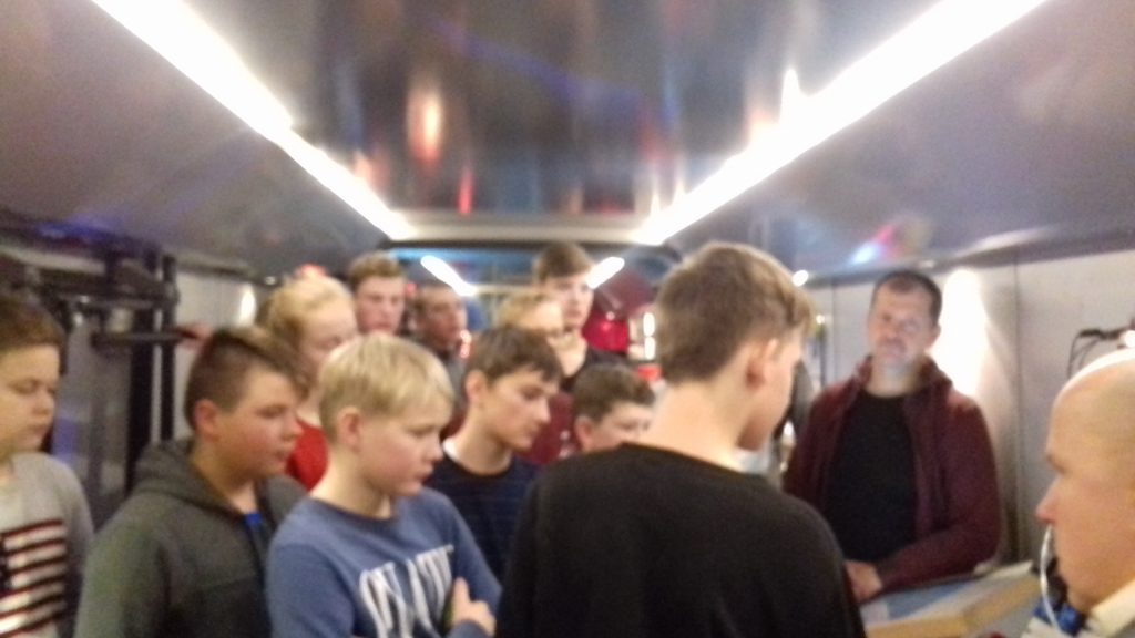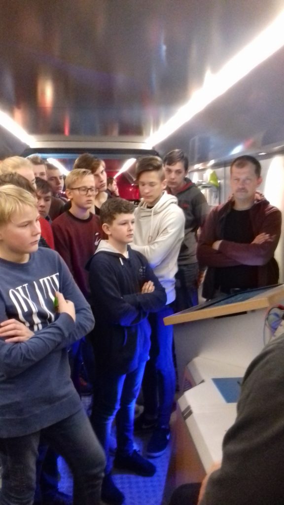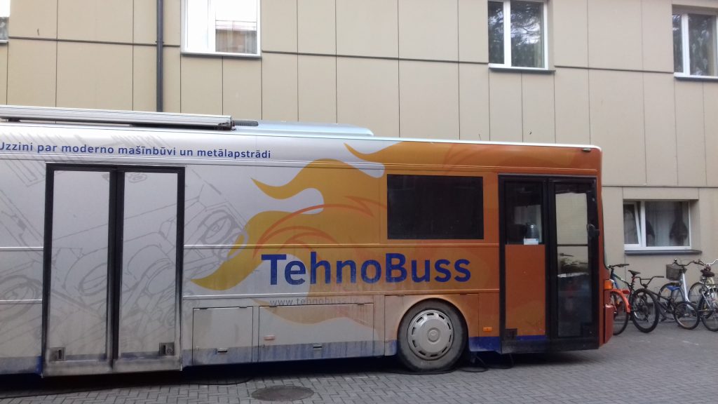 Tehnobusa aizmugurējā daļā tika demonstrēts kā tiek gatavotas detaļas no alumīnija speciālā ierīcē. Mēs uzzinājām par karjeras iespējām mašīnbūves nozarēs. Pašās beigās vienam no klases skolniekiem bija iespēja uzmērīt speciālu kostīmu, kas ir domāts lai aizsargātu metinātājus no ievainojumiem un arī speciālas brilles, kas aizsargā acis no redzes bojājumiem. Uzvelkot šo tērpu pēc tam varēja pamēģināt sametināt kopā divus metāla gabalus un visiem pārējiem bija jāskatās caur speciālu stiklu, lai nesabojātu redzi.