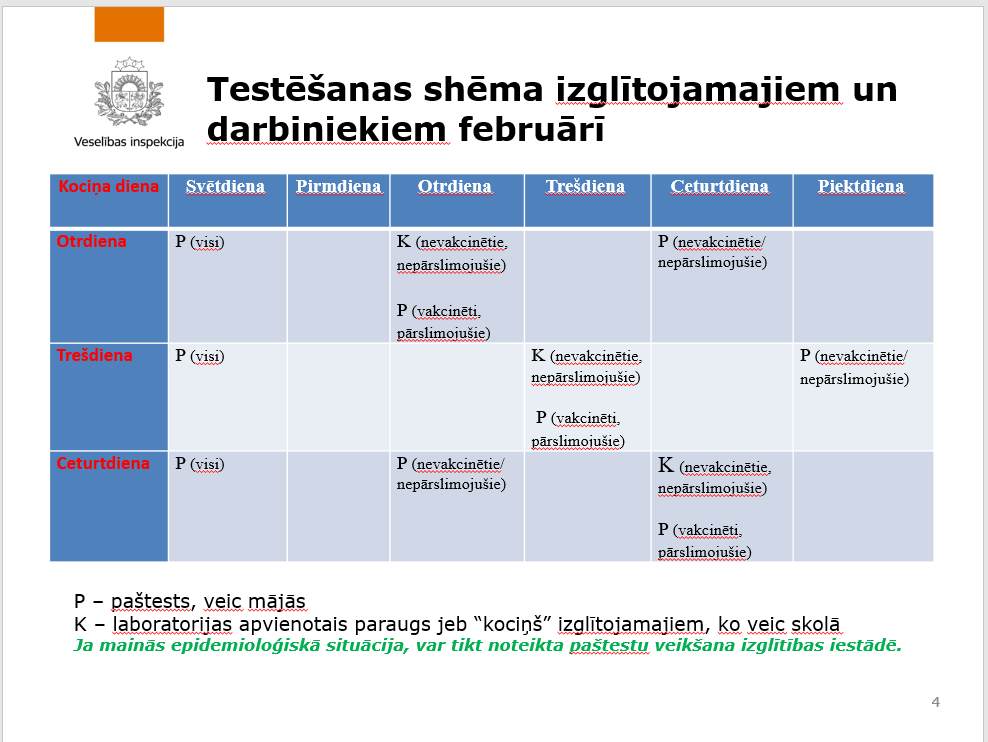 TREŠDIEN – nevakcinētie/nepārslimojušie – rutīnas skrīnings (siekalu) vai pūla tests (pūla testu taisa, ja klasē ir 5 un vairāk bērnu).