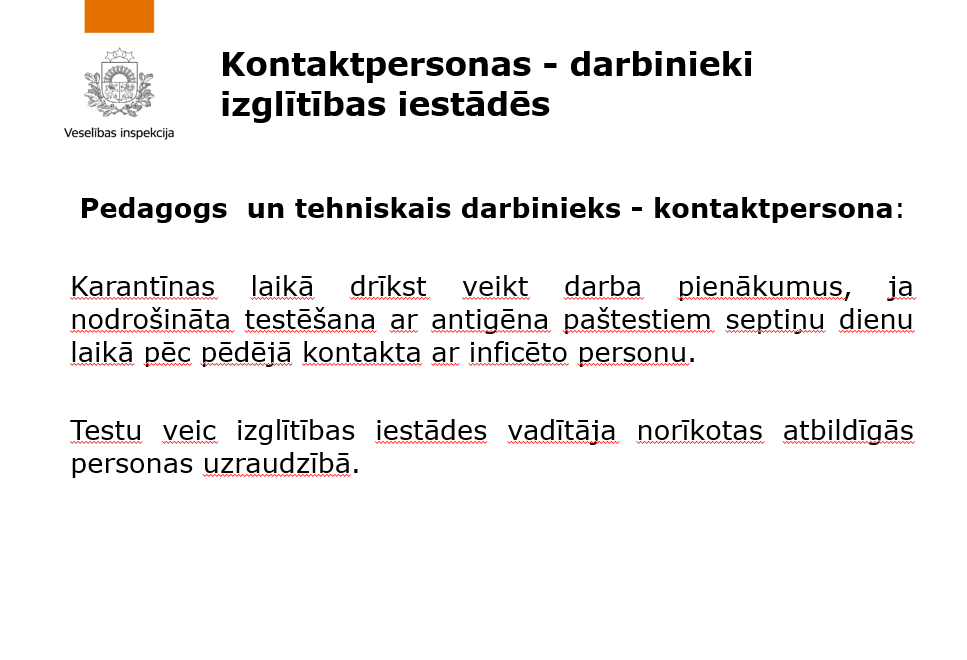 - ja izglītojamais mājas karantīnas laikā (beidzoties mājsaimniecības locekļa izolācijai) vēlās mācīties klātienē, viņam (vecākiem) vajadzētu vienoties ar izglītības iestādes administrāciju par iespēju izglītības iestādē sekot izglītojamā karantīnas laikam un nodrošināt ikdienas testēšanu 7 dienu laikā individuāli.