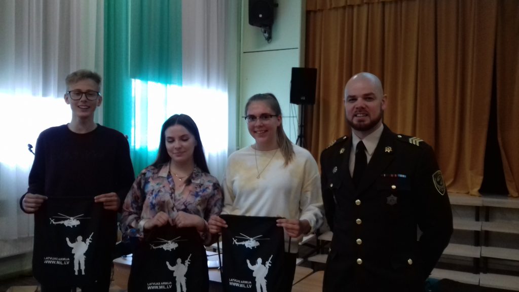 28.maijā 8., 10. un 11.kalšu skolēni tikās ar Latvijas Nacionālo bruņoto spēku Rekrutēšanas centra pārstāvjiem. Tikšanās laikā skolēnus informēja, kas ir NBS, kādi ir bruņoto spēku veidi, kādas specialitātes var apgūt. Sauszemes spēki bāzējas Ādažos, gaisa spēki -Lielvārdē, bet Jūras spēki Liepājā un Rīgā. Izrādās, ka profesijas armijā ir tikai 3 – kareivis, instruktors un virsnieks, bet ir 136 specialitātes, kuras var apgūt, kļūstot par kareivi. Gan , kļūstot par kareivi, gan stājoties Nacionālajā aizsardzības akadēmijā (NAA) primārā pārbaude ir veselības pārbaude, fizisko rādītāju pārbaude, psihodiagnostikas tests. Stājoties augstskolā, protams tiek ņemtas vērā atestāta atzīmes, īpaši matemātikā un fizikā, jāraksta eseja, jākārto tests svešvalodā, jāpiedalās diskusijā, pārrunās un jāprot uzstāties. Beidzot NAA, iegūst leitnanta pakāpi. Studijas ir par brīvu, tiek nodrošināta dienesta viesnīca, nodrošinātas sociālās garantijas un stipendija, ir iespēja sportot.