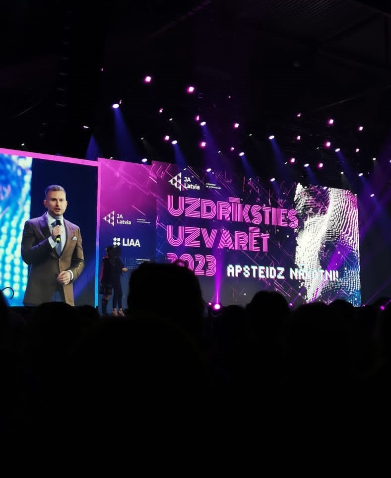 Karjeras nedēļas laikā skolēnu mācību uzņēmumu pārstāvji apmeklēja Junior Achievement Latvia rīkoto konferenci “Uzdrīksties uzvarēt 2023! Apsteidz nākotni”.