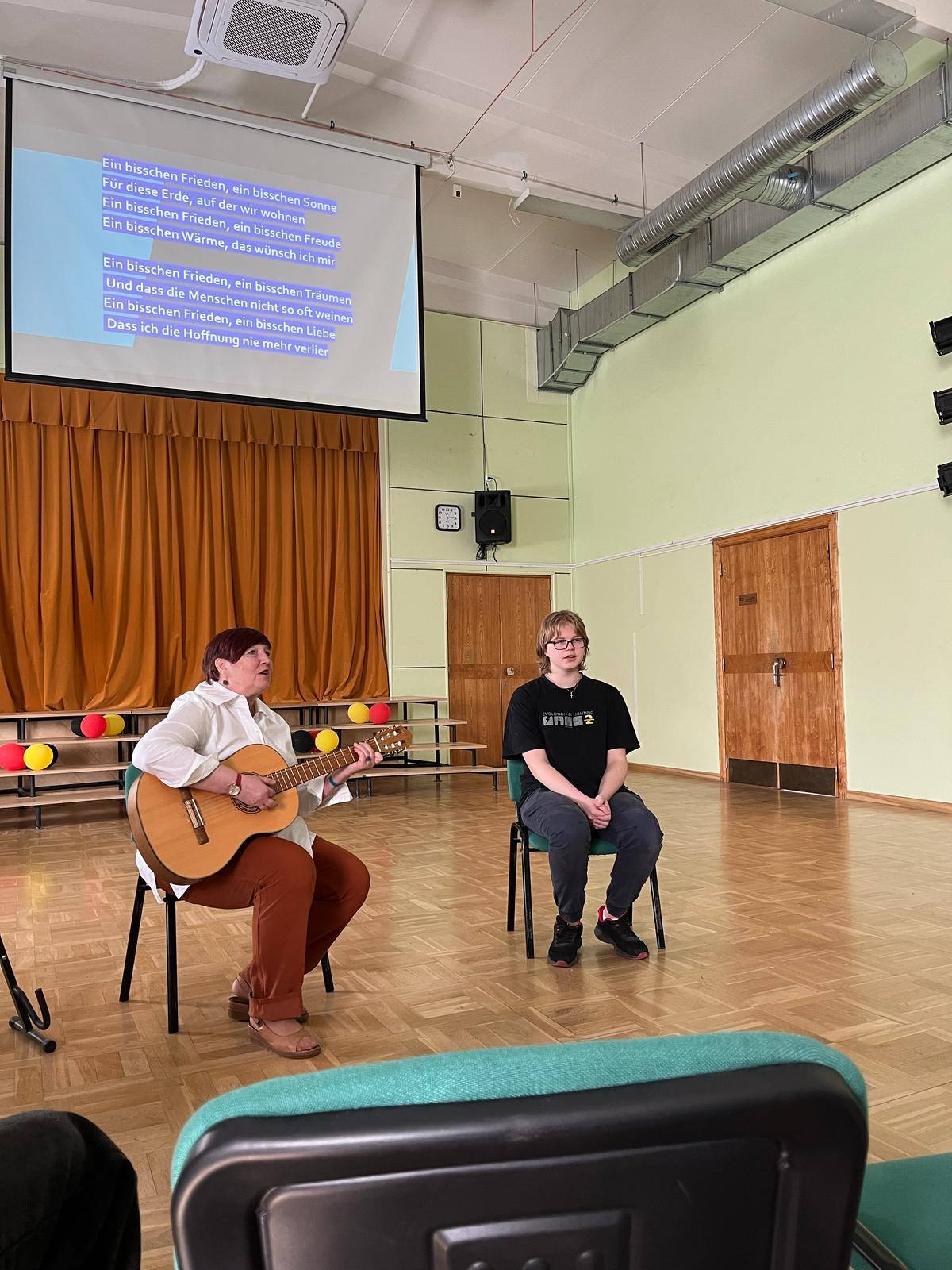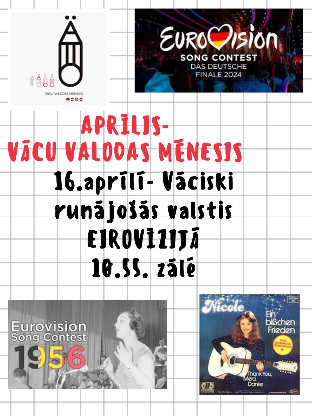 Vācu valodas mēneša ietvaros tikāmies stāstījumā saistībā ar Eirovīziju. Iemesli šai prezentācijai bija divi- Eirovīzijas konkurss pirmo reizi notika Šveicē. Otrs – 1982.gada uzvarētājdziesma, kuru dziedāja 17-gadīgā Nikole ” Mazliet miera”, kuras teksts šobrīd ir īpaši aktuāls.