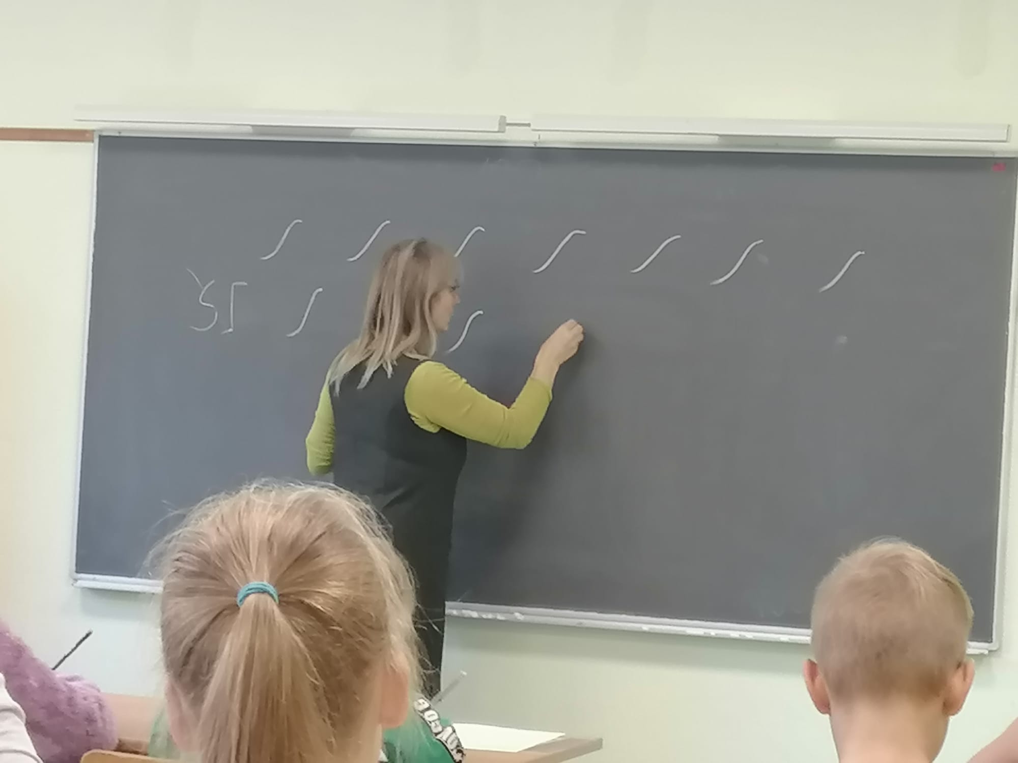 Kā no viena maza lociņa var uzrakstīt tik daudz burtu – neticami, skolēni ar izbrīnu un prieku piedalījās grezno burtu rakstīšanā. Noslēgumā visi gaidījām pasaku par burvju kronīti, bet izrādās, tā mums bija jāveido kopīgi, lietojot staltu stāju, staltu muguru, lai rakstot kronis (pirkstu vingrinājumu izveidots) nenokrīt no galvas.