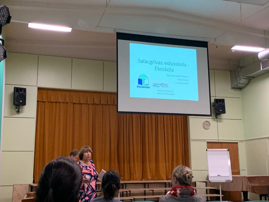 Tālāk klausītājiem bija iespēja uzklausīt Eko skolas prezentāciju, ko pārliecinoši pasniedza Eko skolas koordinatores L.Pelše, L.Tauriņa un Eko padomes prezidente, 12.klases skolniece M. Antonova. Uzzinājām par Eko skolas pamatprasībām, 7 soļiem, kas jāveic kopīgi skolēniem, skolotājiem un vecākiem. Bet Marta ar izsmeļošiem attēliem izstāstīja par skolēnu aktivitātēm.